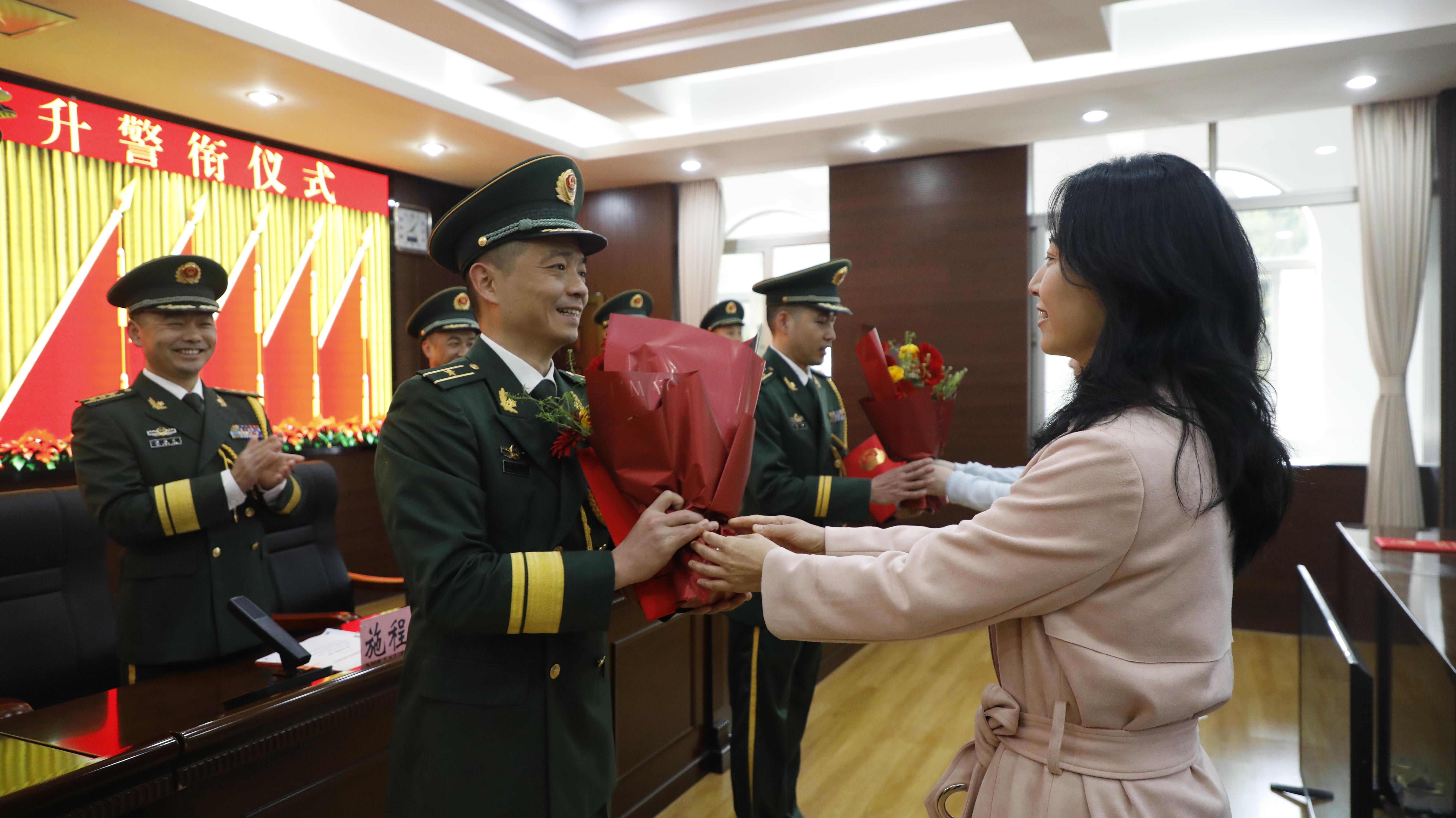 支队首长宣读晋衔命令,现场颁发命令状,为官兵佩戴警衔。晋衔官兵军容严整、目光如炬,依次从首长手中接过象征荣誉的命令状。掌声雷动间,家属们的眼角泛起自豪的泪光。