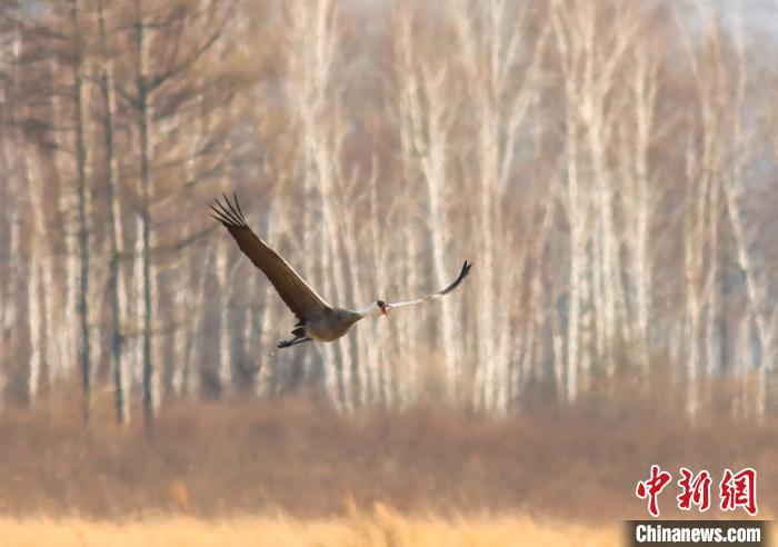 9日,记者从伊春市丰林县委宣传部获悉,黑龙江省伊春市丰林县境内的新青国家湿地公园迎来今年首只北归的国家一级保护动物白头鹤。只见其时而对空长鸣,时而展翅翱翔,为静谧的公园增添了勃勃生机。