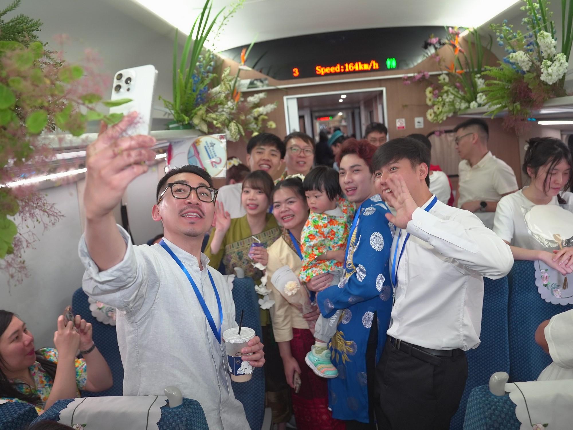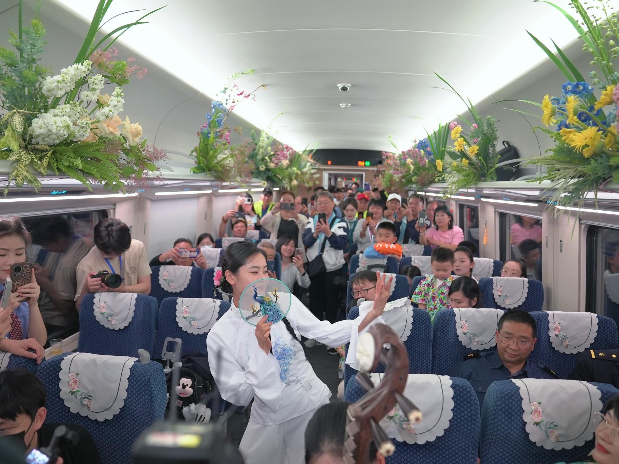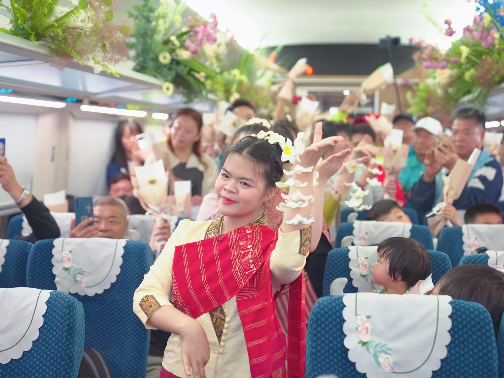 12日当天的这趟列车,以樱花、紫罗兰等花卉与民族文化元素装饰,打造“流动花海”车厢主题空间。当天举办的“钢铁丝路好风光”主题联欢活动中,老挝、泰国留学生用中文朗诵《将进酒》,列车员身着民族服饰表演琵琶伴舞《青花瓷》、老挝舞蹈《占芭花开》等节目,吸引各国旅客载歌载舞。磨憨站特别设置“幸福长廊”,傣族群众以传统泼水仪式为旅客送上澜沧江畔的吉祥祝福,将“一带一路”的文化纽带具象化为可视可感的互动场景。