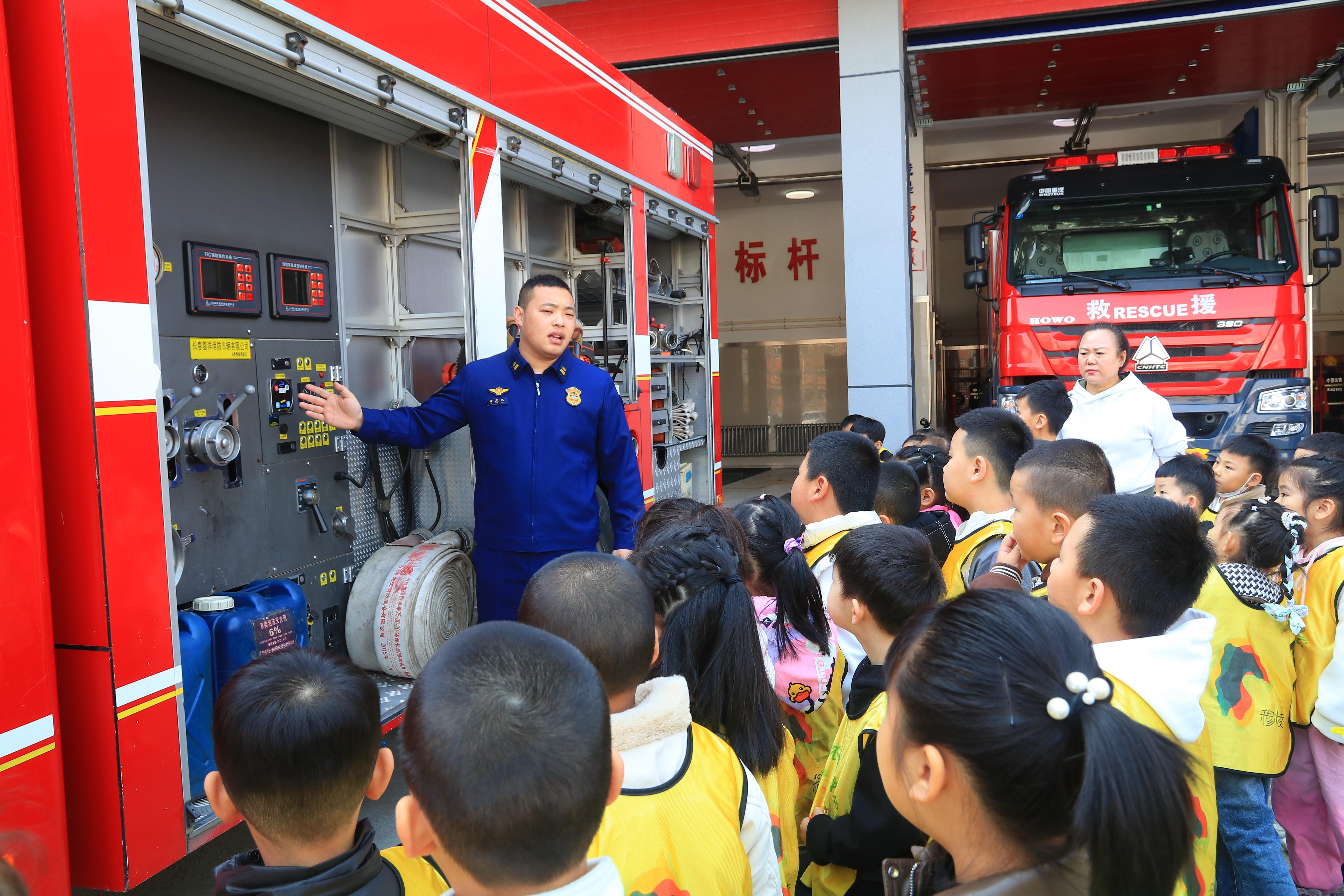 走进消防队车库,孩子们被排列整齐的消防车吸引,高大的消防车、齐全的装备让他们目不暇接。消防员详细讲解了不同类型消防车的功能和车内各种消防设备的用途,并邀请孩子们体验。