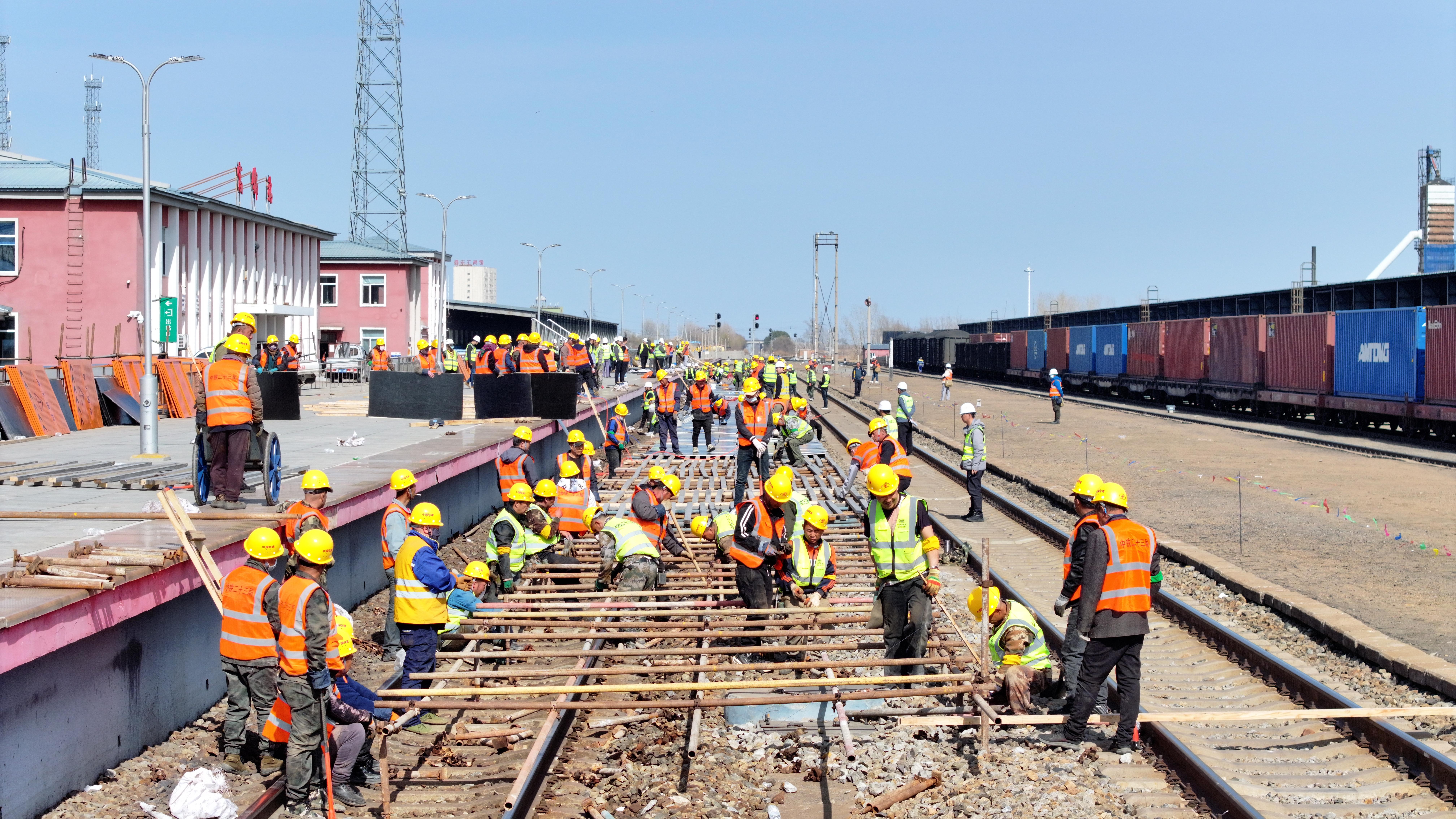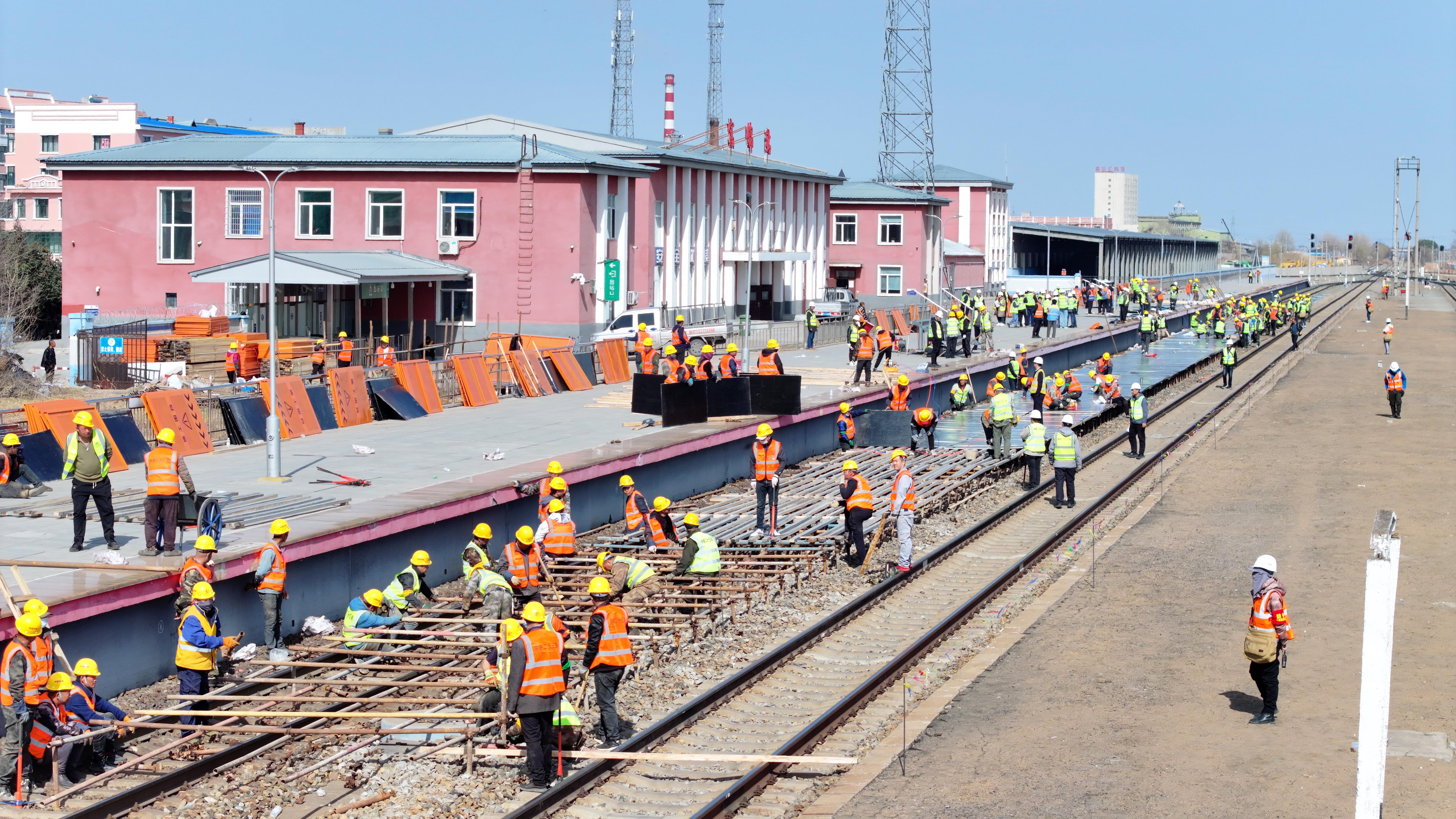 4月14日,在黑龙江富锦站内,随着阵阵机械轰鸣,80名施工人员正在进行临时站台搭建施工作业,这是佳同铁路扩能改造工程首座车站改造施工。