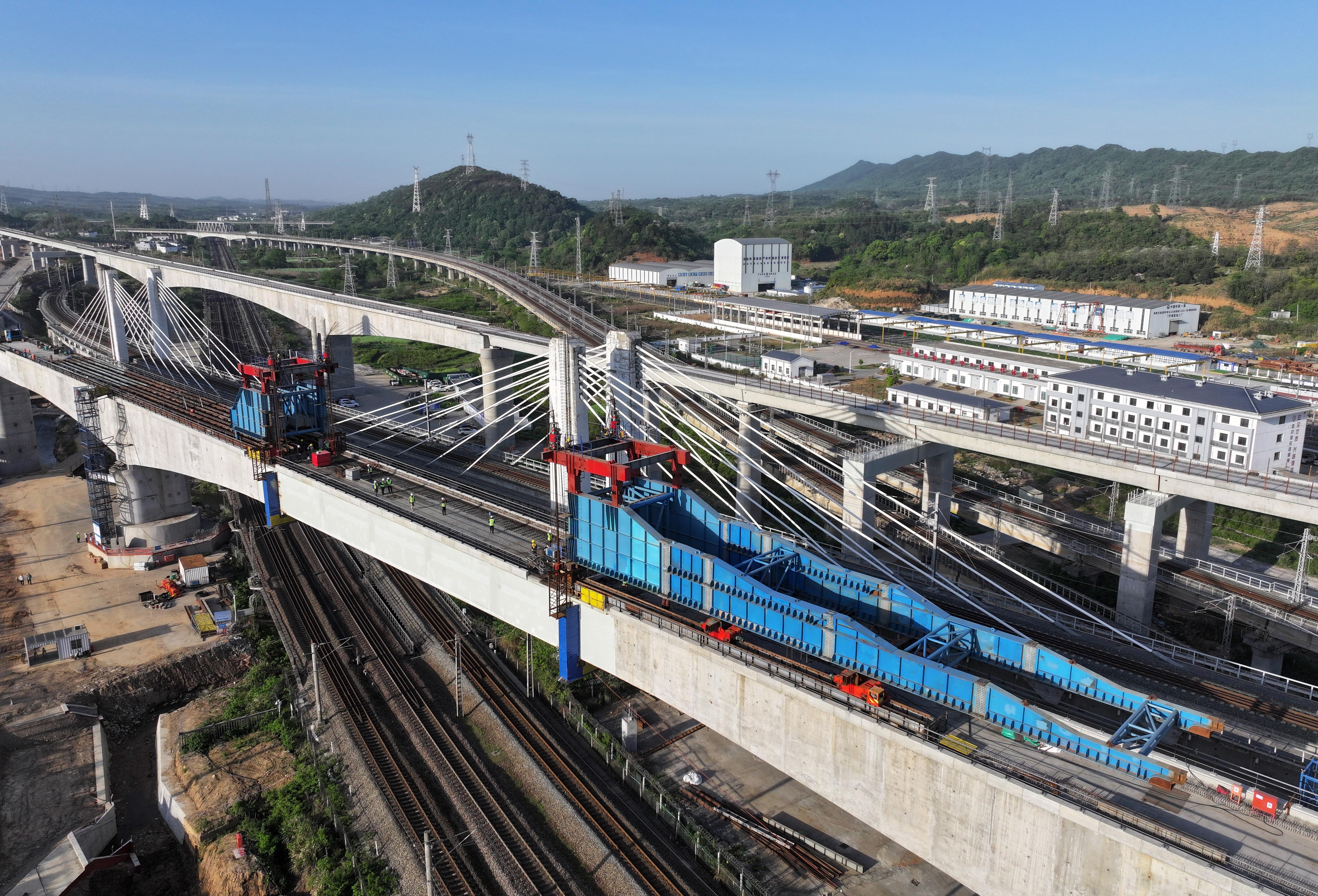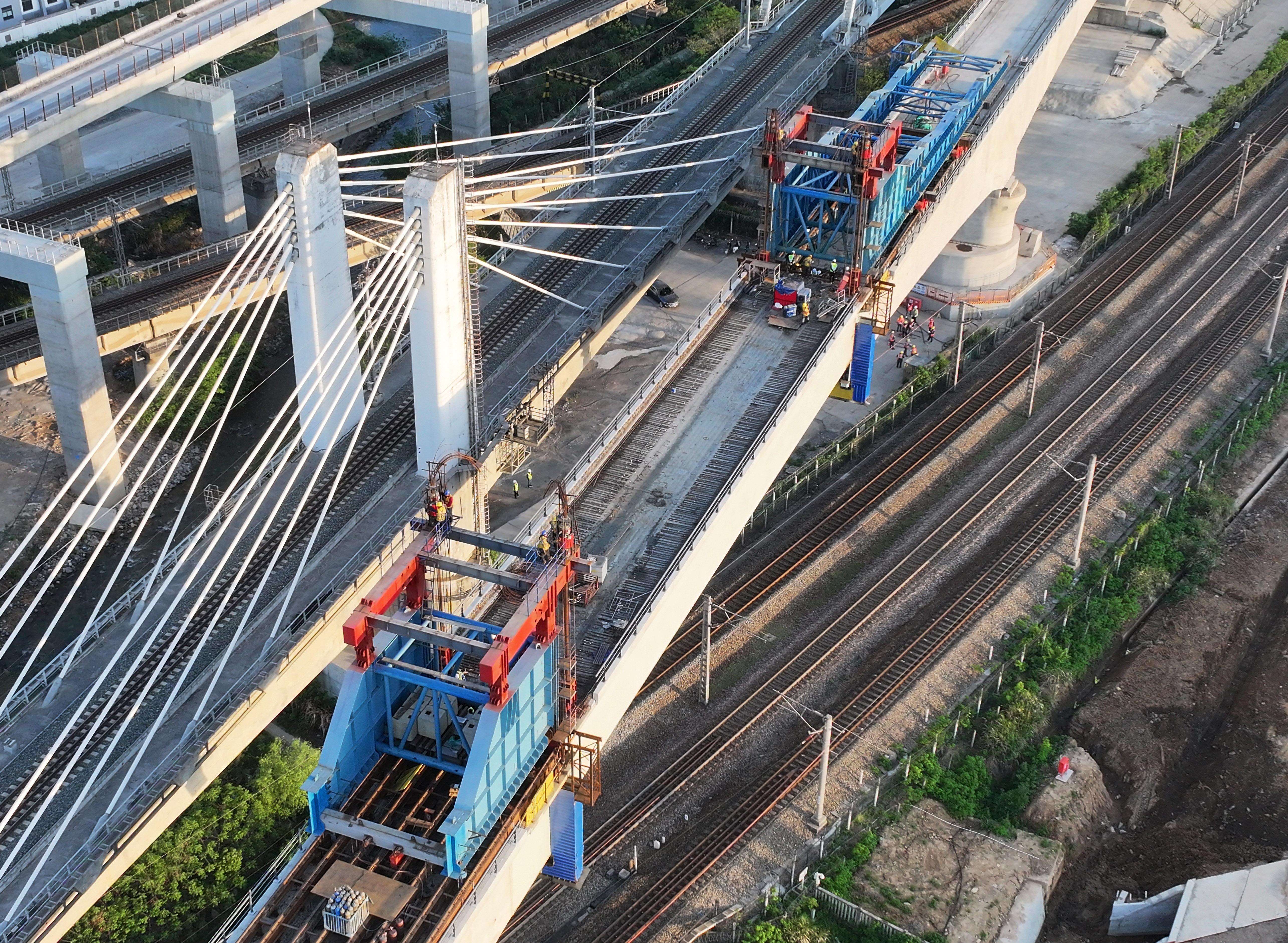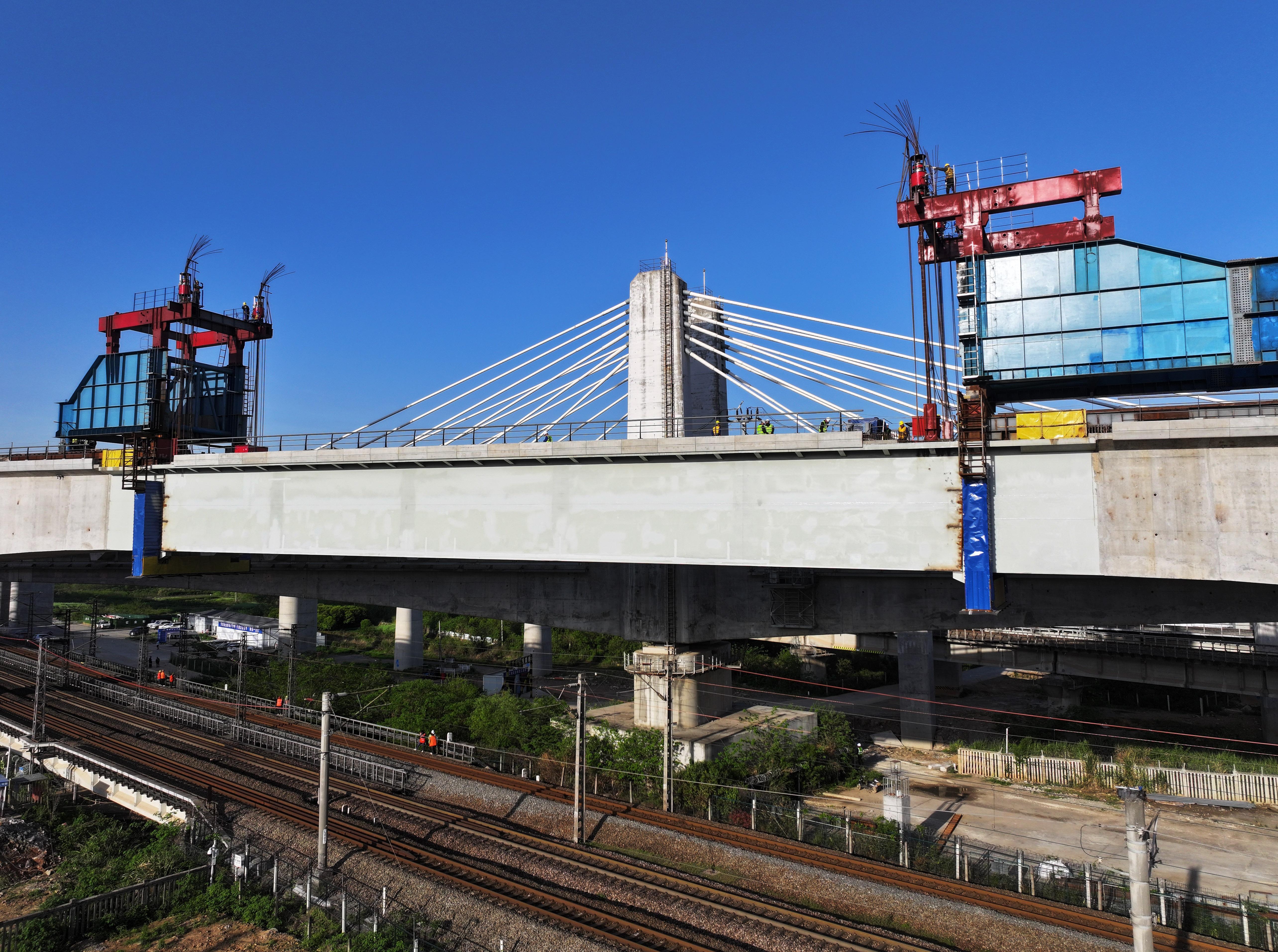 昌九高铁采用国内首创“钢梁大纵坡下坡驮运”技术,将左线跨杭瑞高速特大桥(74+150+74)米钢混连续梁最后一段钢箱梁,安全跨越了京九铁路上、下行正线和武九铁路西南下行联络线3条铁路大动脉,精准稳固地驮运至设计合龙口位置上方,破解了20‰的大纵坡、大跨度、大吨位钢箱梁安装的难题,为钢箱梁正式落梁合龙奠定了基础。