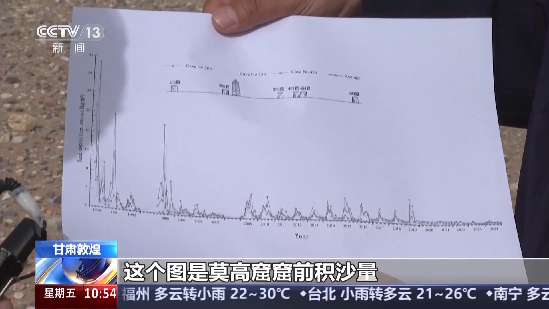 敦煌研究院敦煌石窟监测中心研究馆员 张国彬:这个图从1990年到2024年窟前积沙量,1990年积沙量时很高,每平方米30千克,特别是到2010年之后,我们工程完成以后,它就慢慢减少,2019年之后你看这个数量很特别已经很少了。窟前积沙量,由以前20世纪80年代的3000立方米减少了85%,现在也就不足200立方米左右,这是最明显的一个效果。