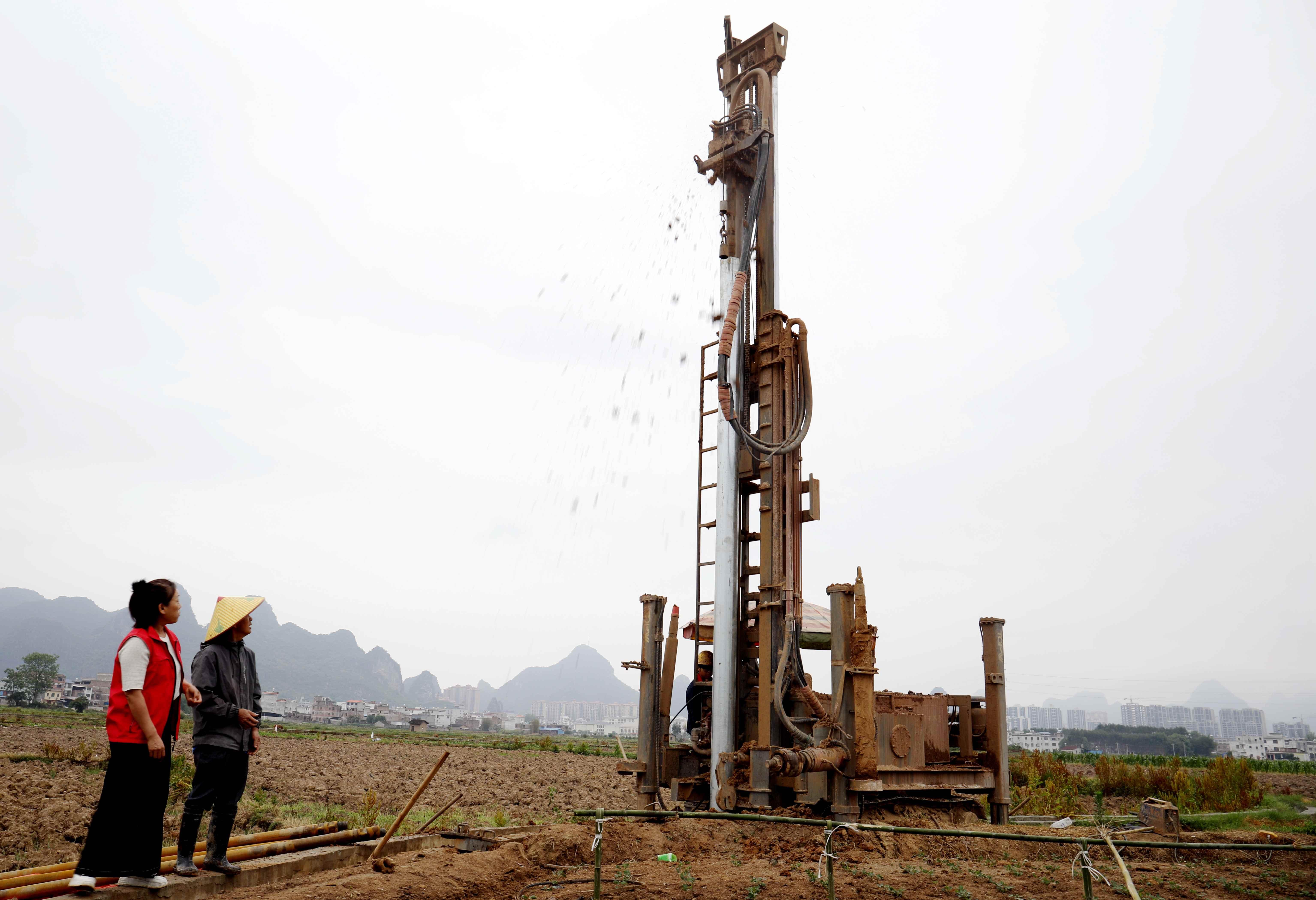 4月23日,在广西贺州市平桂区鹅塘镇丹村一处稻田里,机器轰鸣声不断,钻井工人熟练地操作机械,将地下的一团团泥土顺着管道不断地抽取上来。