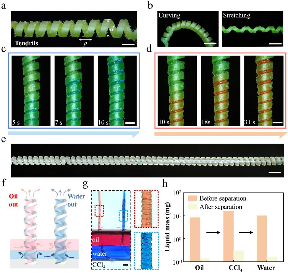 研究团队首创基于黄瓜卷须螺旋结构的仿生弹簧微通道(SMC),通过高精度投影微立体光刻3D打印技术实现微流控泵的仿生设计、极端制造与性能动态调控。该仿生功能系统创新性地融合表面润湿性与分子极性协同机制,突破传统分离器件依赖静态多孔材料的局限,成功实现油—水—四氯化碳等多相体系的界面极精准自主捕捉与物相高效连续分离,分离通量高达292.5Lm⁻²h⁻¹,效率稳定超过99%,攻克了传统技术界面识别困难、易堵塞等瓶颈问题。
