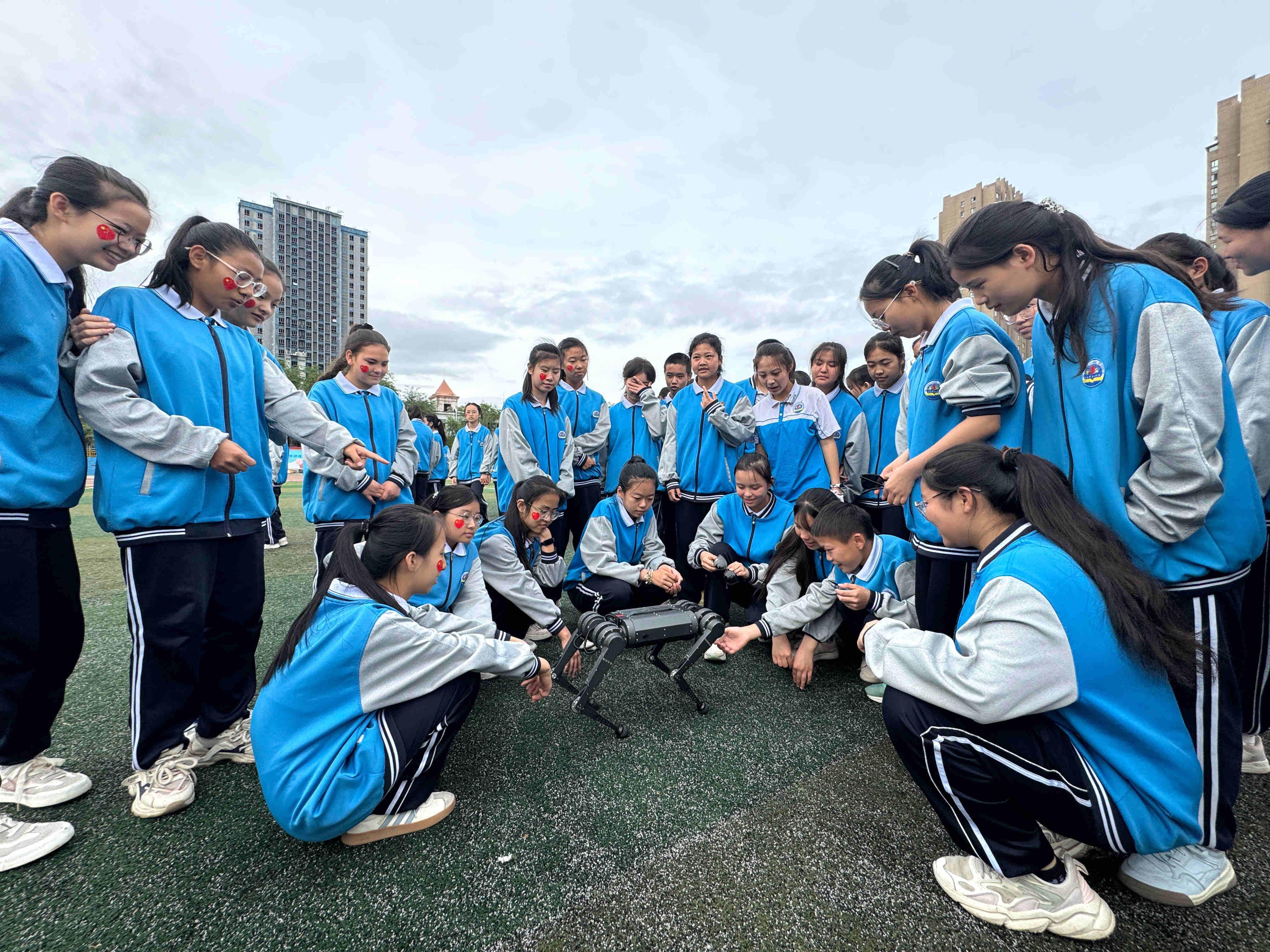 活动现场,创意制造展示及无人机表演区人气爆棚。随着音乐响起,无人机编队在天空中不断变换阵型,勾勒出绚丽图案,将科技与艺术的融合展现得淋漓尽致;憨态可掬的机器狗灵活展示各种动作,还与围观学生亲密互动,引得阵阵惊叹与欢呼。