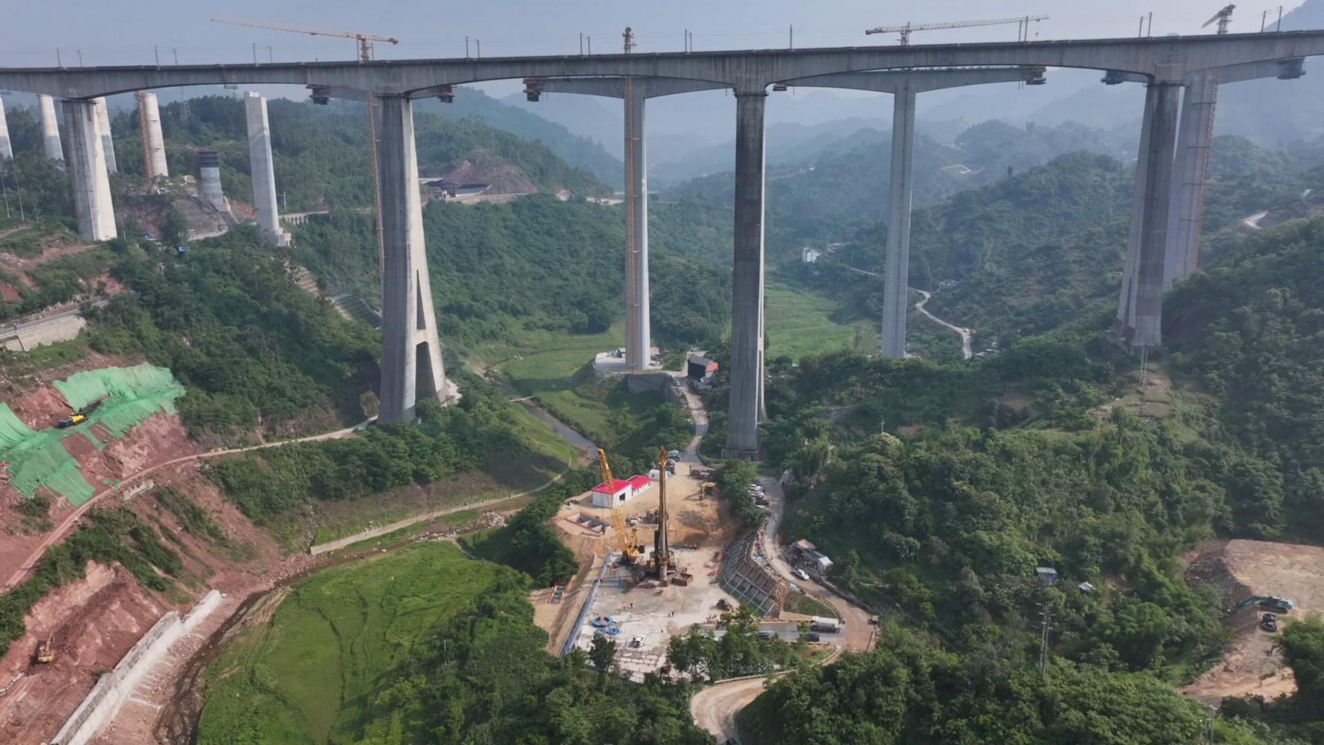 蔡家沟特大桥位于重庆市涪陵区,桥梁全长约2006米,设计桩基共344根,承台27个,墩台身27个。此次开钻的是9号墩,高度为165米,为全线最高墩,也是国内首座设计时速350公里、墩高165米的高铁连续刚构桥梁第一高墩。