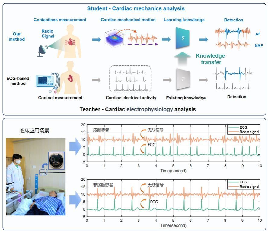 研究人员介绍,房颤发生时,心脏电脉冲的有序传导遭到破坏,紊乱的电信号在心房内无序传播导致节律失调。这种电生理紊乱会引发异常的机械运动,进而驱动胸壁位移形成体表机械波动,该现象可被毫米波雷达检测。这为通过体表机械运动分析诊断房颤提供了新思路。