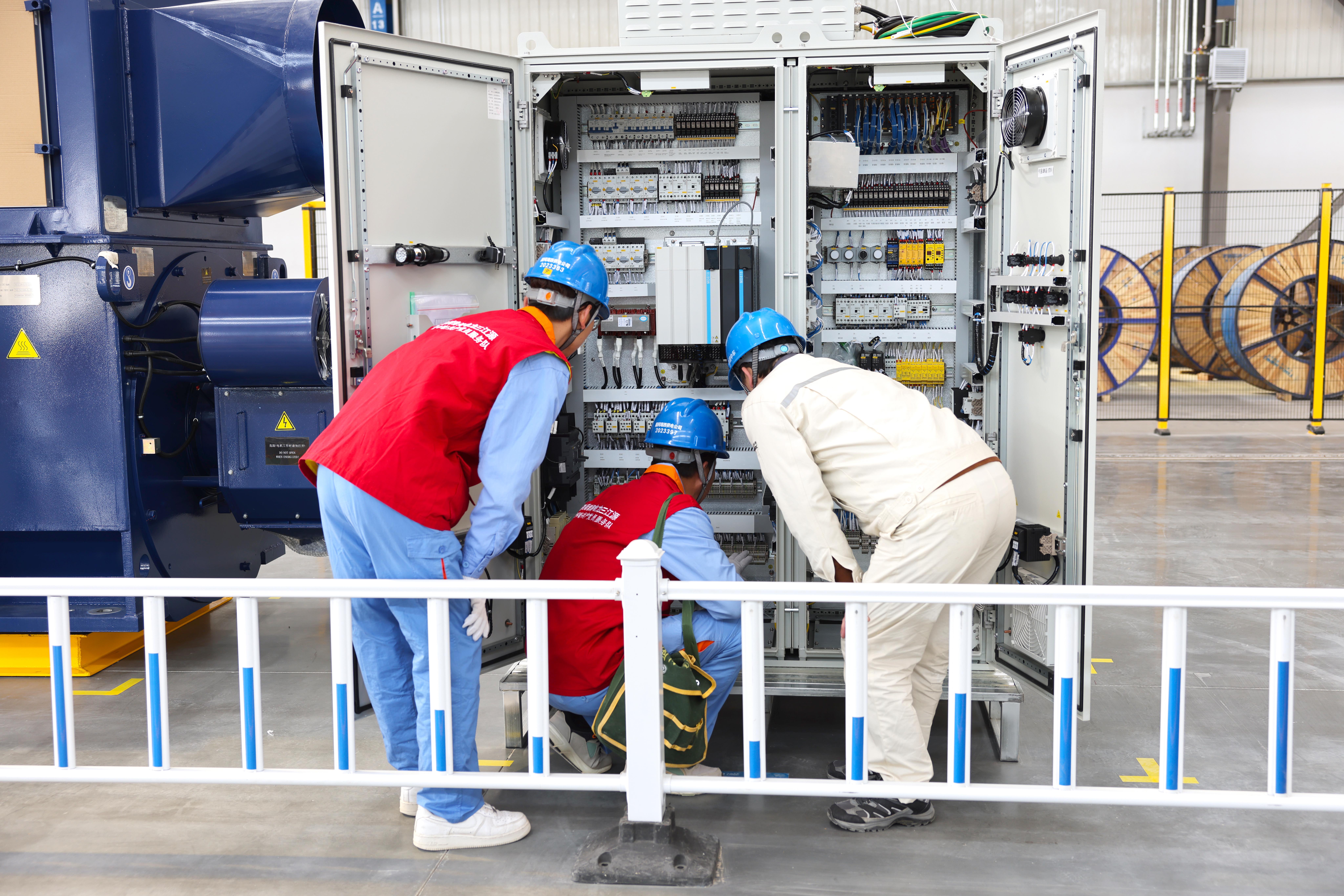 国网青海电力三江源(海西德令哈)共产党员服务队队员袁复军、尹海鹏在园区配电室内对馈线柜开展红外测温,协助制造基地特巡电力设备。他们身后是正在建设的中车德令哈100万千瓦源网荷储项目。