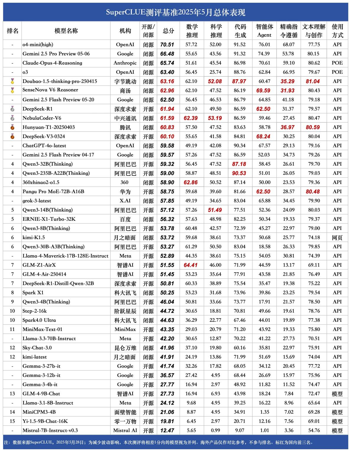 中文大模型测评基准SuperCLUE最新发布的《中文大模型基准测评2025年5月报告》显示:中兴通讯自主研发的星云大模型Nebula Coder-V6在竞争激烈的推理专项榜单中强势摘金,总分并列第一,同时在综合总榜中斩获银牌(并列第二)。