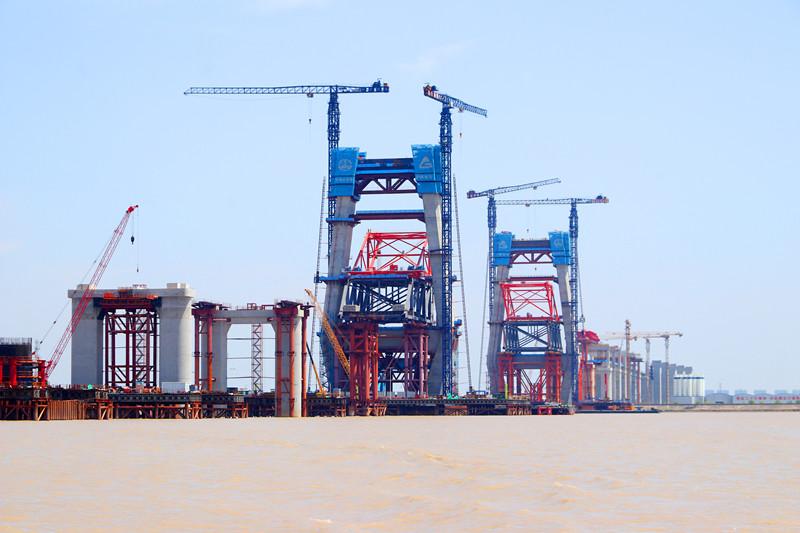 6月8日,中铁大桥局承建的沪渝蓉高铁V标崇启公铁长江大桥主通航孔桥首吊钢梁顺利架设完成。