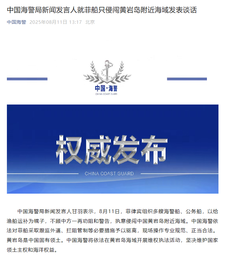 中国海警局新闻发言人甘羽表示,8月11日,菲律宾组织多艘海警船、公务船,以给渔船运补为幌子,不顾中方一再劝阻和警告,执意侵闯中国黄岩岛附近海域。中国海警依法对菲船采取跟监外逼、拦阻管制等必要措施予以驱离,现场操作专业规范、正当合法。黄岩岛是中国固有领土。中国海警将依法在黄岩岛海域开展维权执法活动,坚决维护国家领土主权和海洋权益。
