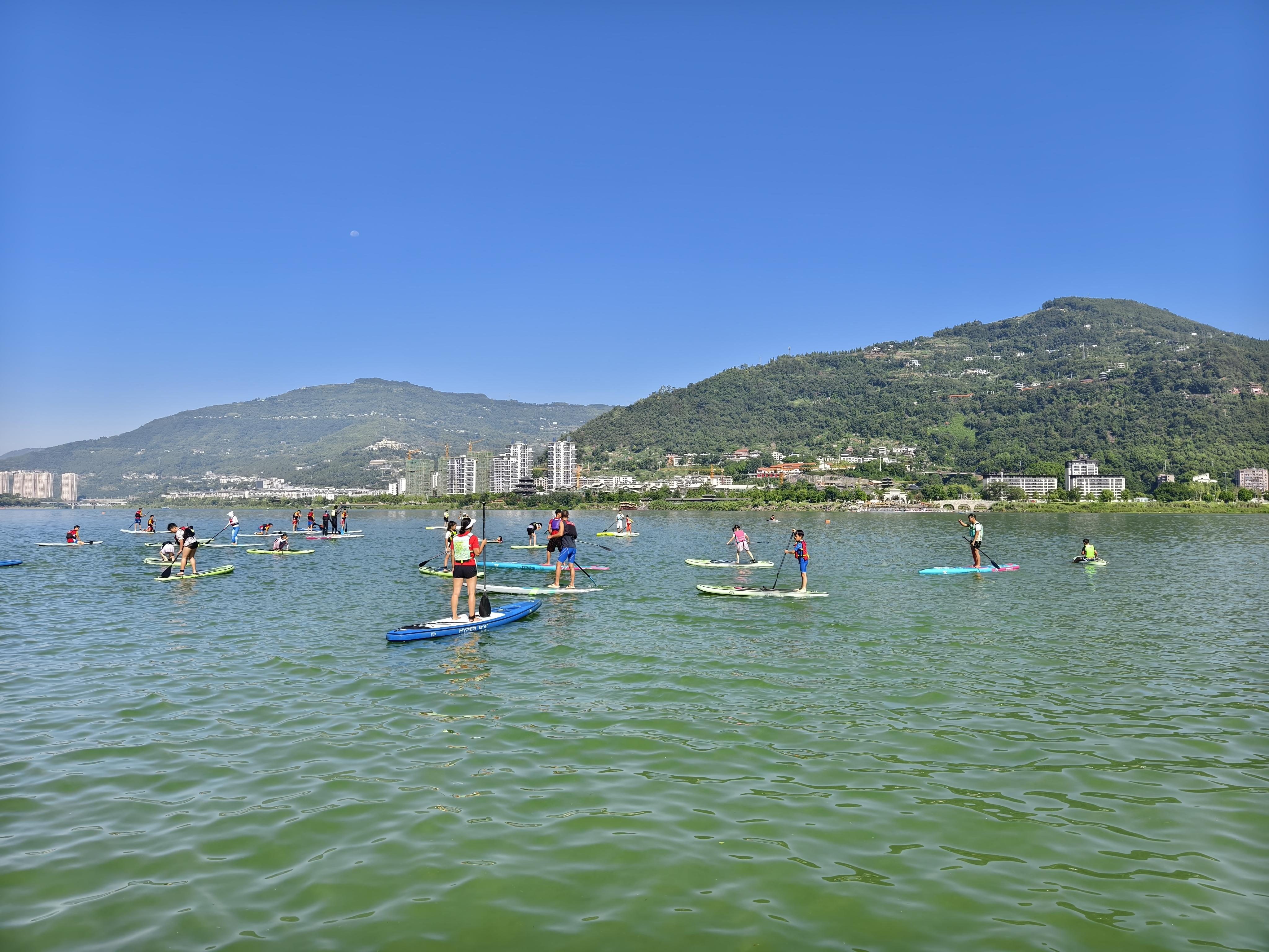 走进重庆市开州区的汉丰湖,清澈的湖面上,一群孩子们正不亦乐乎地练习着划桨板。