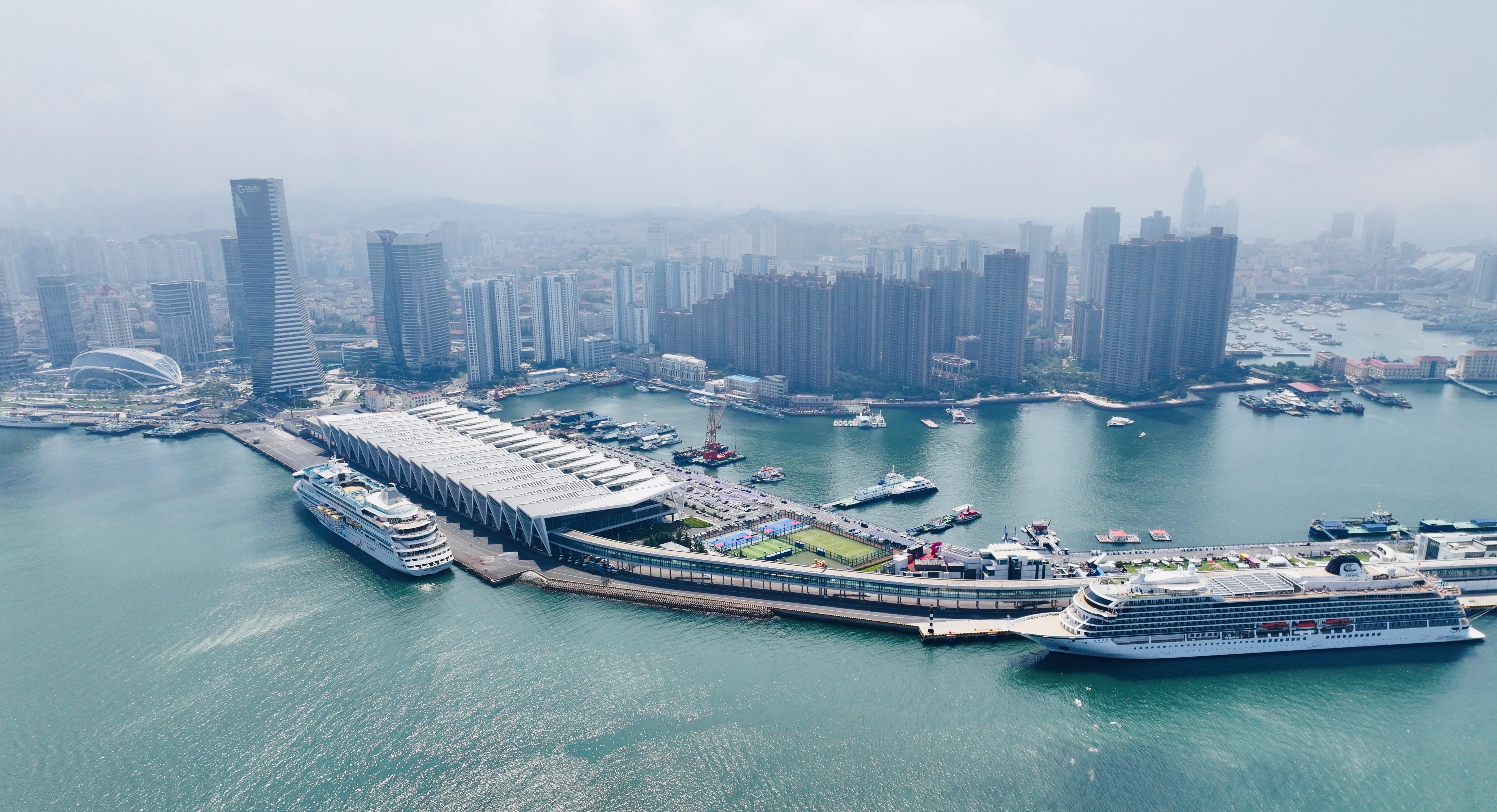 8月19日,在青岛邮轮母港,海风裹挟着热闹气息。豪华邮轮“招商伊敦”号、“蓝梦之歌”号并肩停靠码头。这是青岛邮轮母港复航以来的首次“双邮轮同靠”。