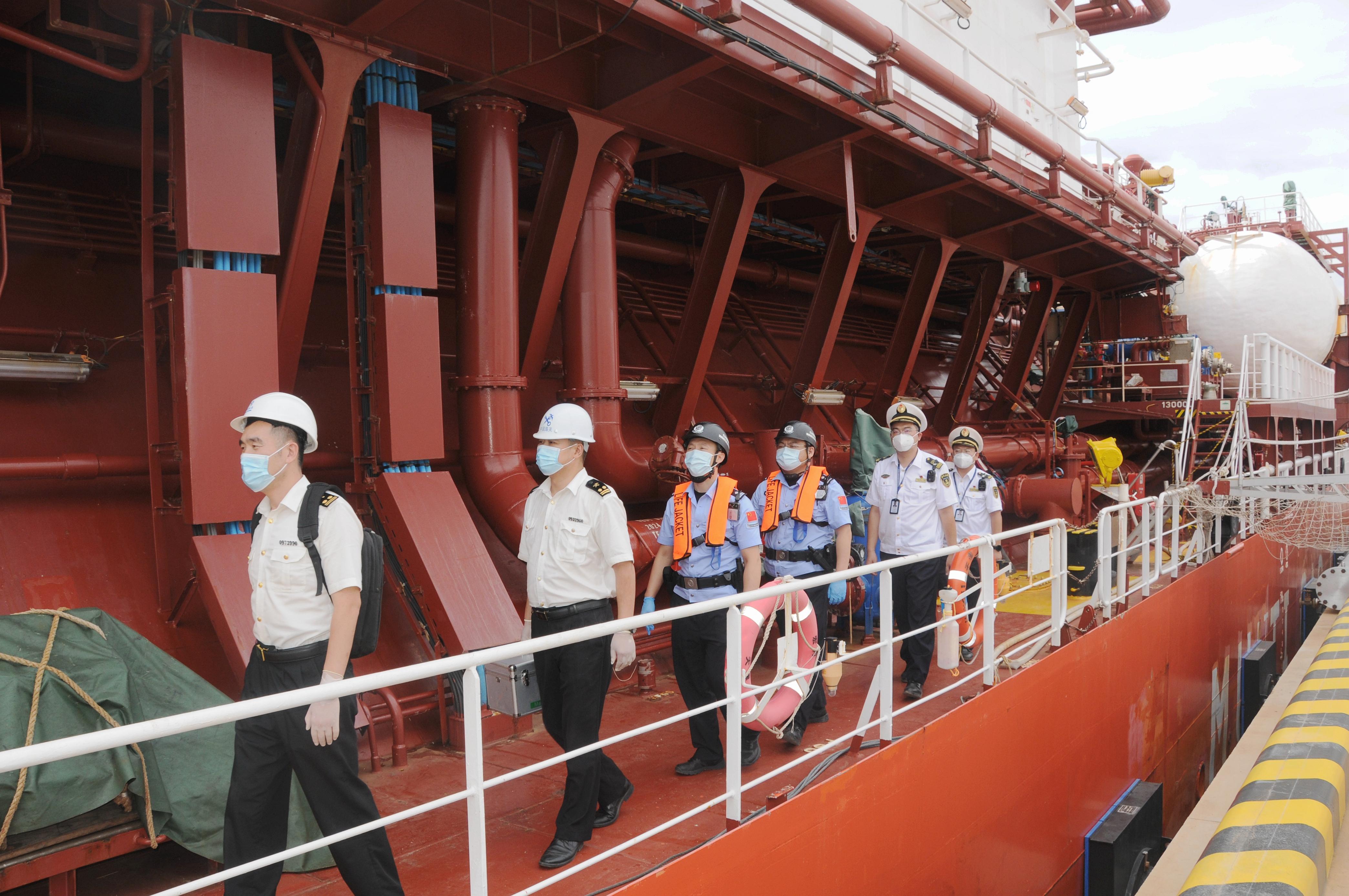 靠泊当日,派遣“海巡03001”轮进驻现场水域,实施全程通航秩序维护,实时监控航道动态,有效防范船舶碰撞风险,保障水上运输通道畅通。此外,联合海关、边检组建联合检查组,为船舶开辟绿色通道,同步高效开展船员证件核查、货物申报核验、安全与防污染措施检查。通过信息共享、协同联动,显著提高了查验效率,有效缩短了船舶在港停留时间,实现了“一次登轮、多项核查、高效通关”,切实降低了企业物流成本。