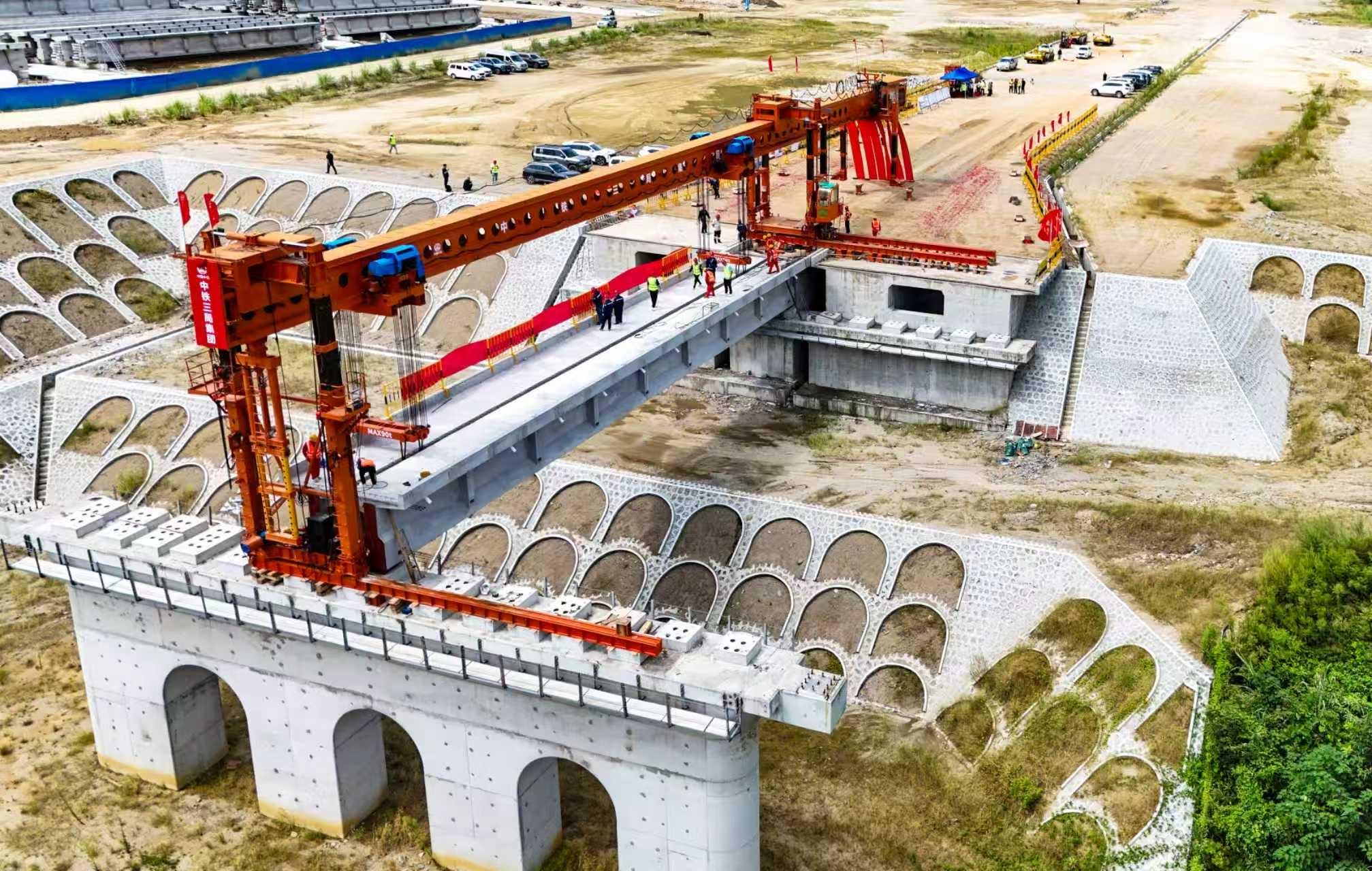 施工现场投用灵活机动、安全性和自动化程度高的TJ180架桥机与YLJ200运梁车协同作业。“项目部积极推广智慧化技术应用,依托“BIM(建筑信息模型)+GIS(地理信息系统)”数字孪生技术、北斗定位系统、智能安全调度系统、立体防护网结合AI识别技术,实现对T梁运输、架梁、精准下落全流程的动态监测、智能调度与风险预警,保证首架顺利进行。”中铁三局宜昌三峡疏港铁路Ⅰ标段总工程师郝世全介绍。