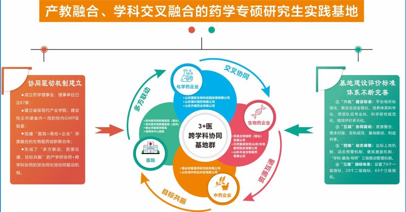 滨州医学院驻地是山东烟台。作为医药大市,烟台现有生物医药类规上企业120余家,每年仅学校所在地区生物医药领域人才缺口达千余人。学校在“校企合作对药学专业学位研究生培养质量提高的影响研究”“药学专业型联合培养基地建设标准及评价体系研究”“药学专业学位研究生‘校企合作’培养模式研究与实践”等省部级及以上教改课题项目研究基础上,开展“医-理-工”全链条覆盖、跨学科协同的药学专业硕士培养基地群的构建与实践。