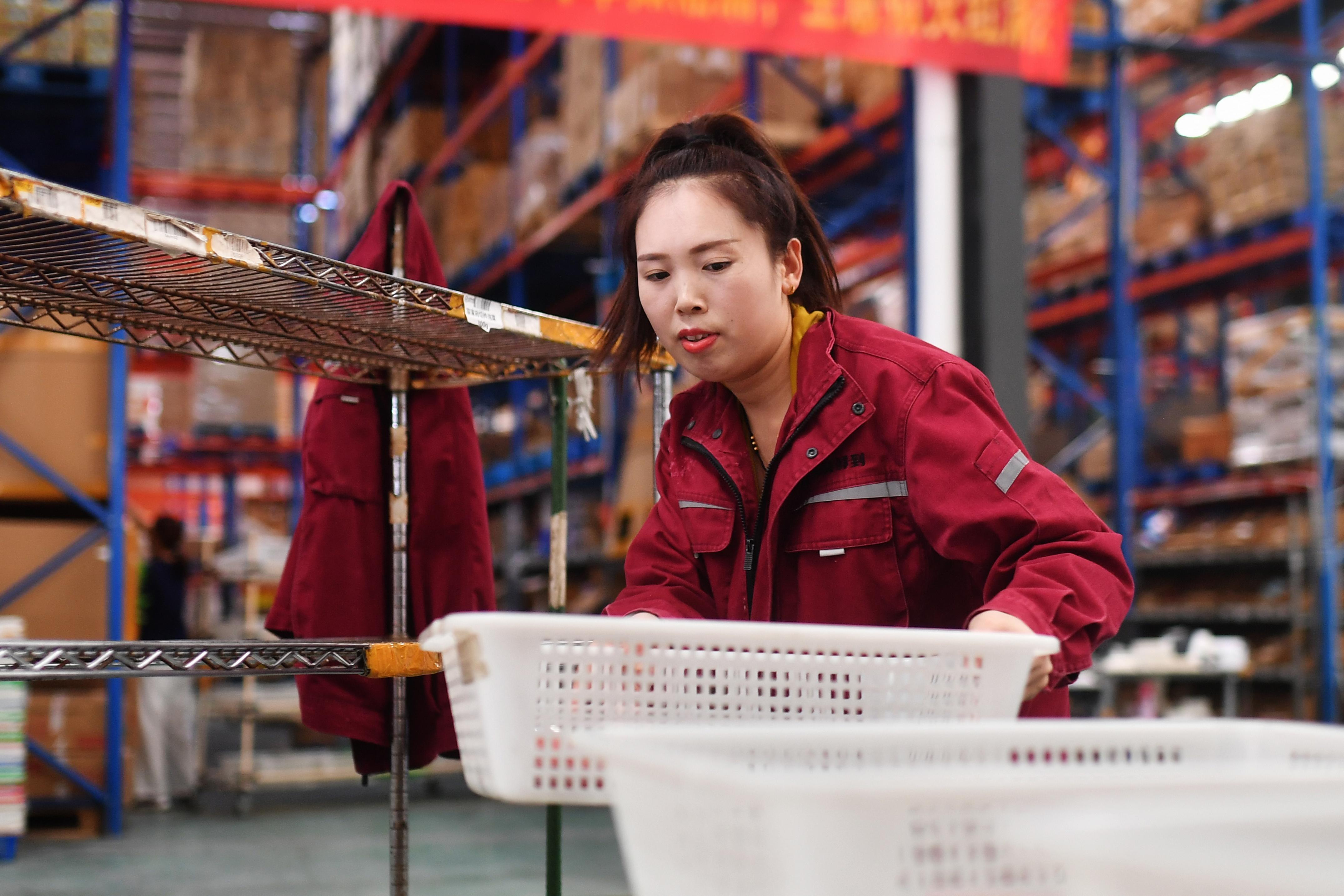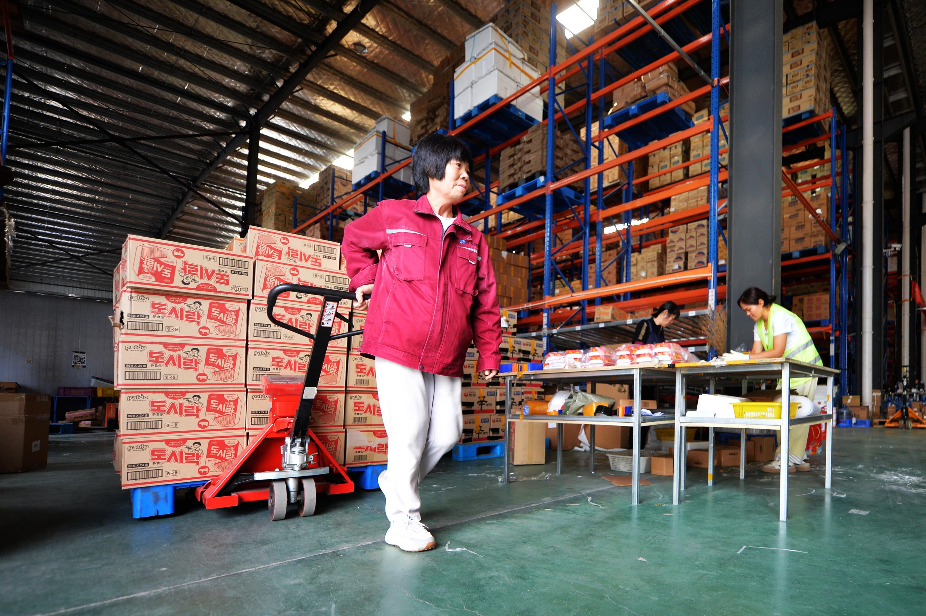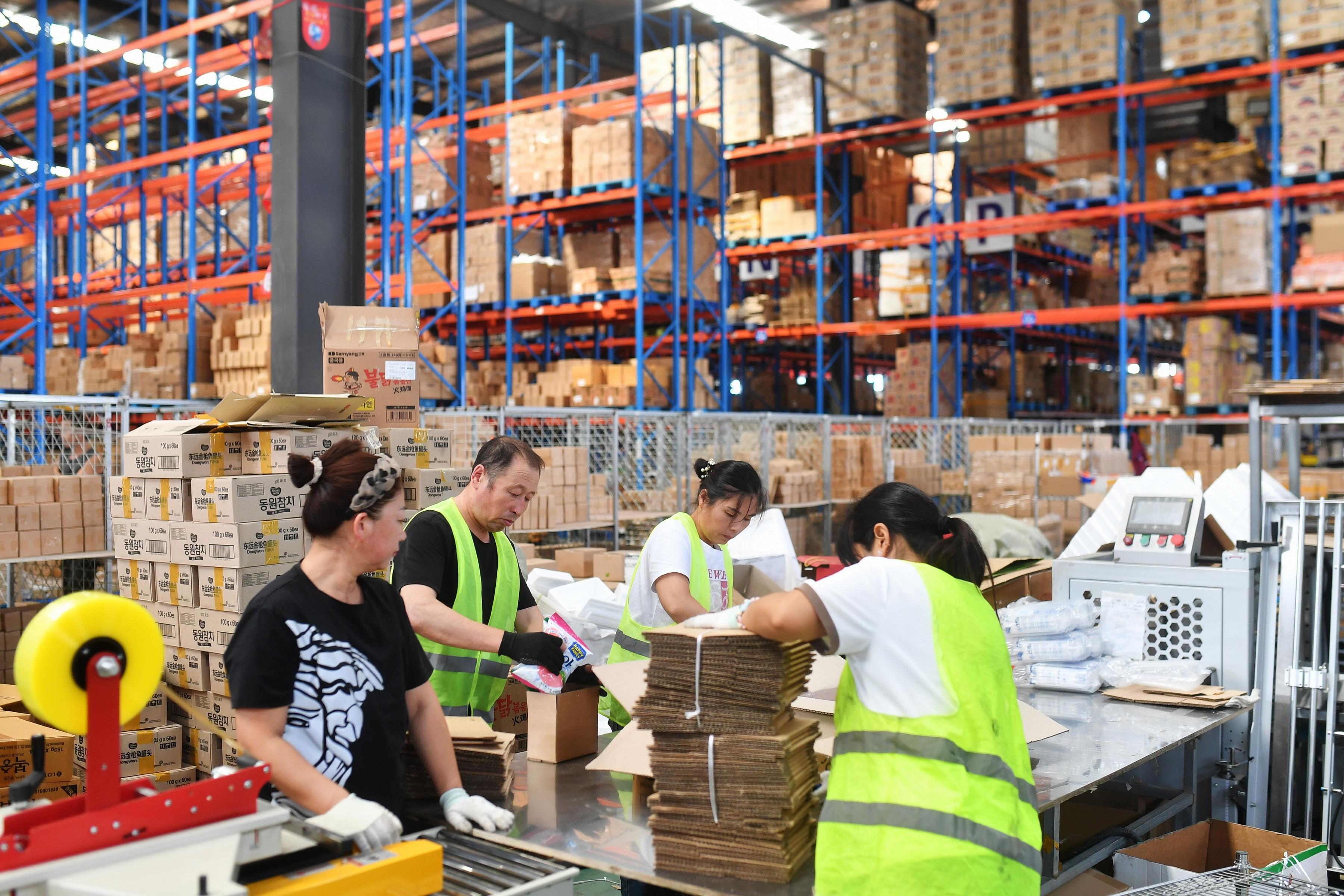 10月1日,国庆节当天,位于山东省青岛市城阳区夏庄街道的青岛鲜美鲜到供应链管理有限公司,包装流水线上的一线员工坚守岗位,保障国庆假期电商商品及时送到用户手中。