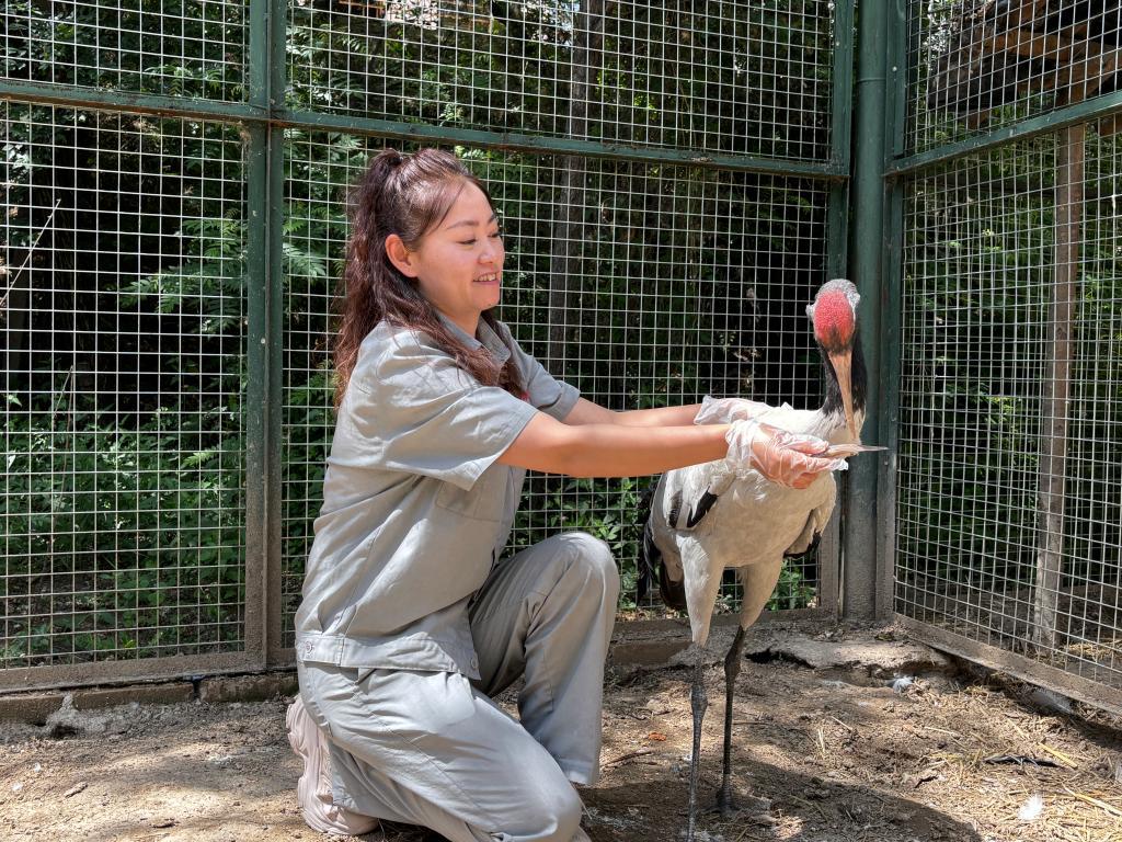 前两年,“千鹤”的妈妈因为受伤在野外落单,被人们发现并送往西宁野生动物园进行救助。2023年7月,“千鹤”在这里降生时,工作人员专门为它开辟了15平方米的单独鸟舍,配备恒温装置和监控设备。饲养员每天会根据它的生长情况调整食谱,从最初的碎肉糜到如今的荤素搭配营养餐,精心照料下,“千鹤”身体日益强壮。
