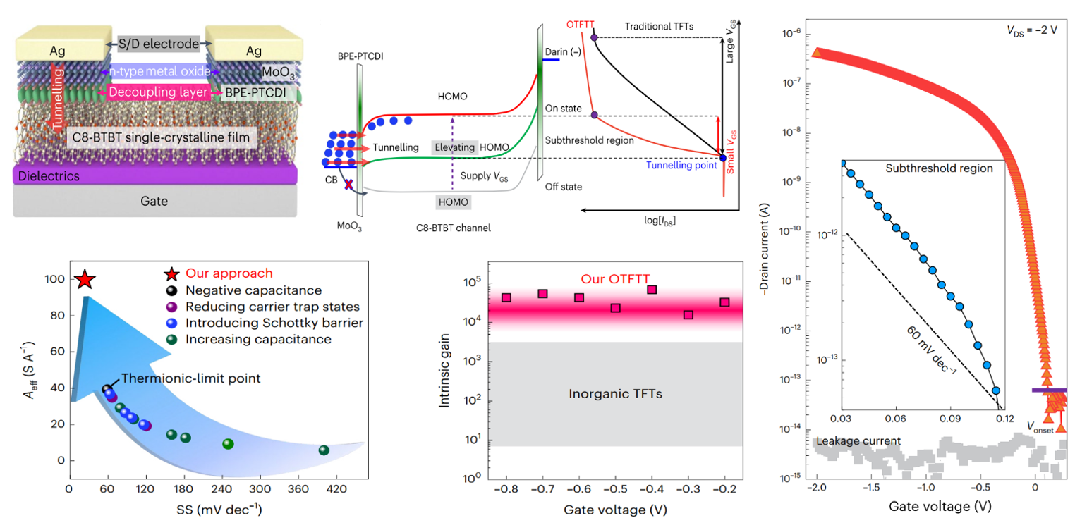 要满足柔性电子应用需求,有机薄膜晶体管不仅需要具备足够高的电学性能,还须能在低的工作电压下运行。然而,如何在低电压下维持有机薄膜晶体管的高电学性能,一直是该领域的核心挑战。这一难题主要归因于传统有机薄膜晶体管的亚阈值摆幅(SS)值,即将电流开关一个量级所需电压的大小,通常受制于玻尔兹曼热电子发射理论的限制。