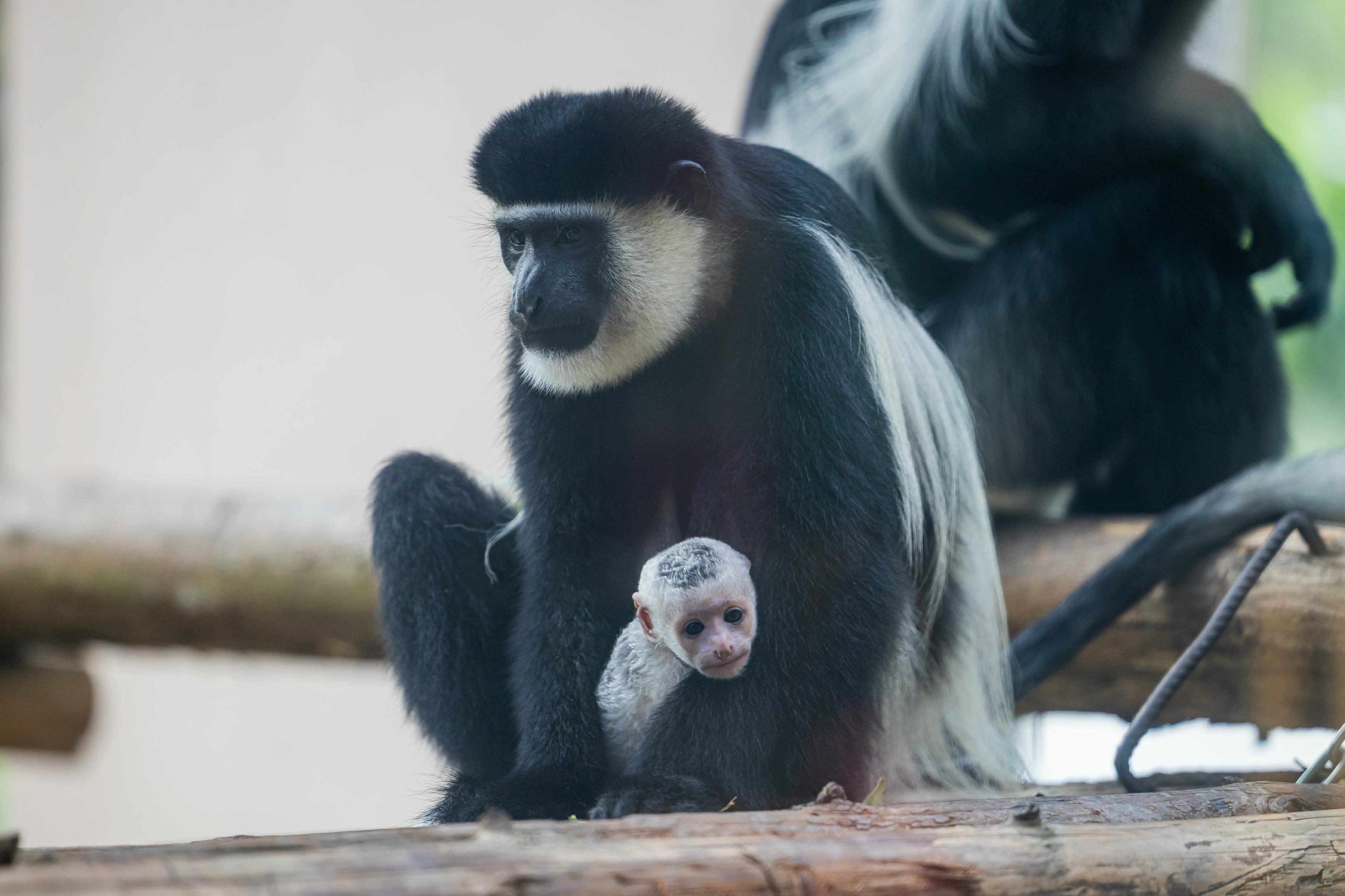 保育员阚涛介绍,“国庆”所在家族现由2只公猴、1只母猴及1只亚成体共同组成。随着“国庆”的加入,该展区目前共生活着5只黑白疣猴。