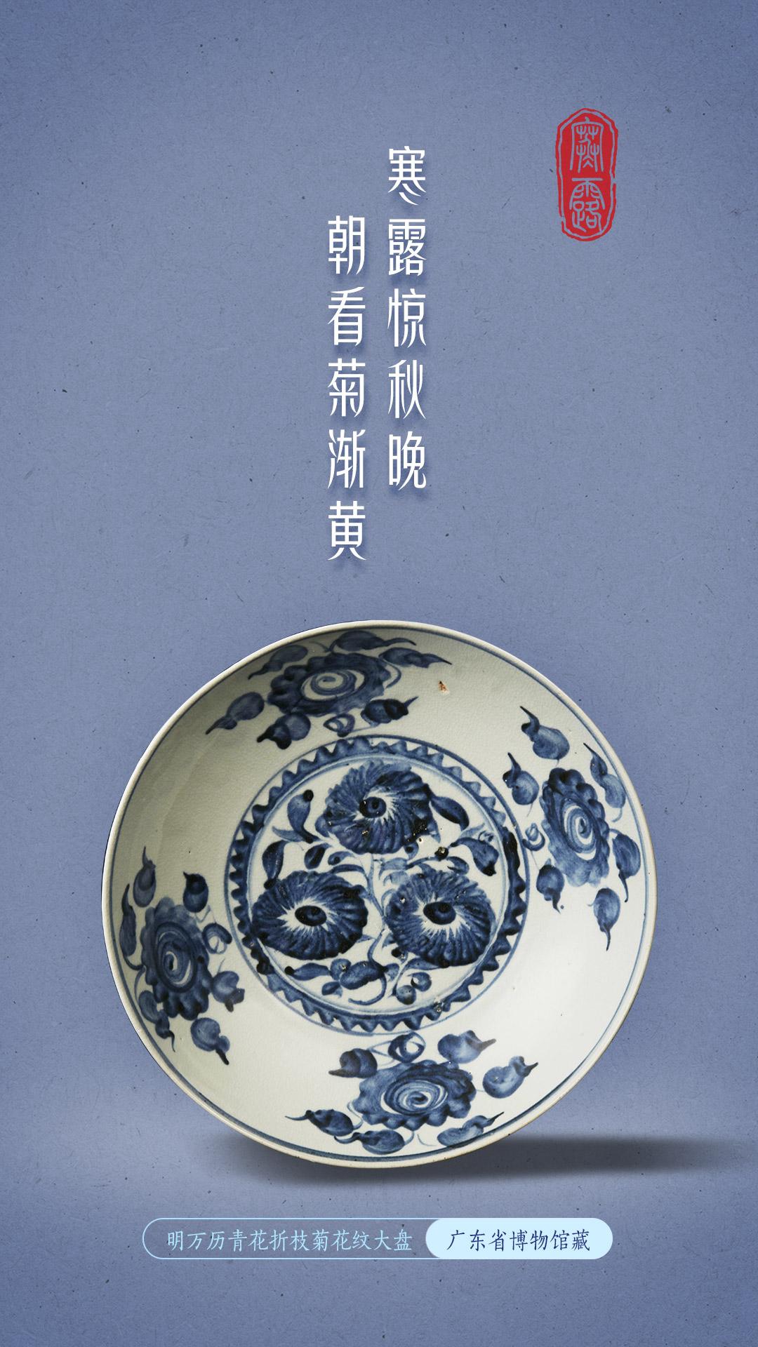 菊花因其不畏严寒、傲然开放的姿态,成为古代文人、画家作品中的常客。明清时期,官窑瓷器和织物纹样中的菊花纹,也在注重色彩层次的匠人手下变得越来越栩栩如生。这件明万历青花折枝菊花纹大盘,出自“南澳一号”明代沉船,现藏于广东省博物馆。大盘敞口,浅腹,圈足。胎体灰白,青花发色灰蓝。口沿一周绘四朵菊花纹饰,盘心绘一周波浪纹,双圈内绘三朵怒放的青花折枝菊花,花四周有叶片衬托,纹饰饱满富有层次感。