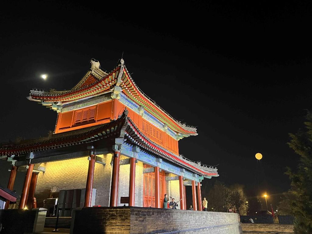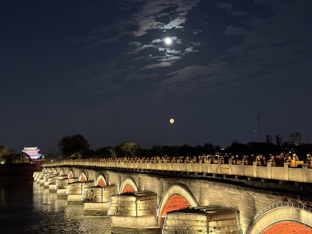 科技元素贯穿活动全程,成为最大亮点。城墙开放仪式上的3D光影秀以宛平城西城墙为幕,通过“宛平建城”“守家卫国”等四个篇章,让砖瓦土石在光影中“堆叠”成城,明代将士身影与红色光影帷幕交替呈现,生动还原历史场景。中秋当日,高约40米、直径5米的光影“月亮”从西南城墙升起,与天上圆月形成“双月映卢沟”的奇景,17:00至22:00持续点亮的光影盛宴,成为市民打卡热门。