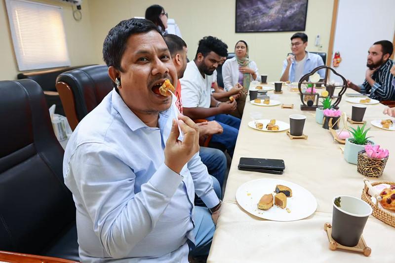 茶话会现场,桌上的美食成为连接中外文化的纽带。豆沙、莲蓉、五仁等多种口味的中秋月饼,与椰枣、芒果等沙特当地特色水果相映成趣。中外员工围坐在一起,一边品尝美食,一边畅谈交流。有人分享中国各地过中秋的习俗,有人介绍沙特传统节日的特色,在轻松的对话中比较着不同文化的异同。一枚小小的月饼,成为传递文化的使者;一句简单的“中秋节快乐”,承载着跨越语言的真诚祝福。