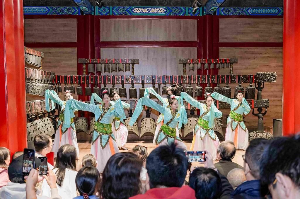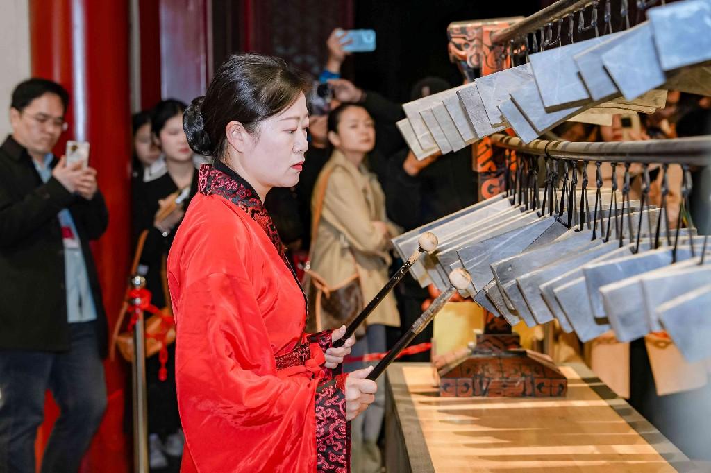 白天的定时免费讲解服务采用智能语音导览设备,观众可实时收听古钟历史、铸造工艺的详细介绍,文物故事触手可及;晚间活动更具科技亮点,古风NPC巡游搭配移动灯光跟随系统,营造动态穿越场景;编钟乐舞歌舞剧通过专业音响与舞台灯光调控,精准传递古代宫廷艺术的庄重与优美;“永乐大钟鸣响祈福”环节则通过声效放大技术,让深沉钟声回荡全场,强化沉浸式祈愿体验。