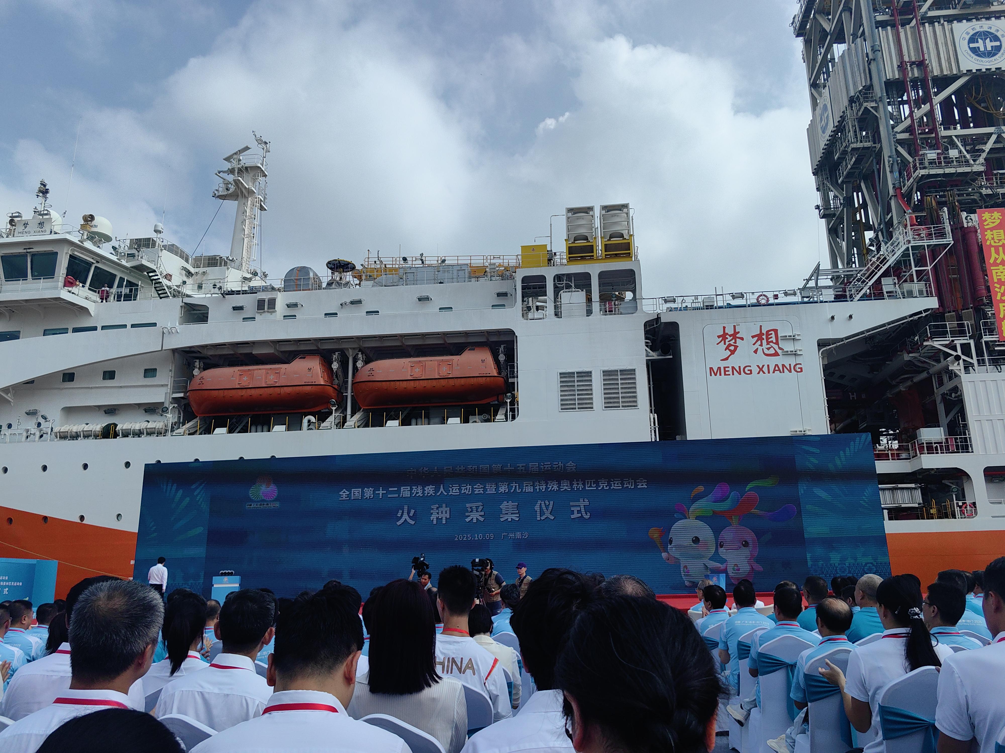 10月9日上午,位于广东省广州市南沙区的广州海洋地质调查局科考码头气氛热烈。在“梦想”号大洋钻探船的见证下,第十五届全国运动会和全国第十二届残疾人运动会暨第九届特殊奥林匹克运动会火种采集仪式举行。