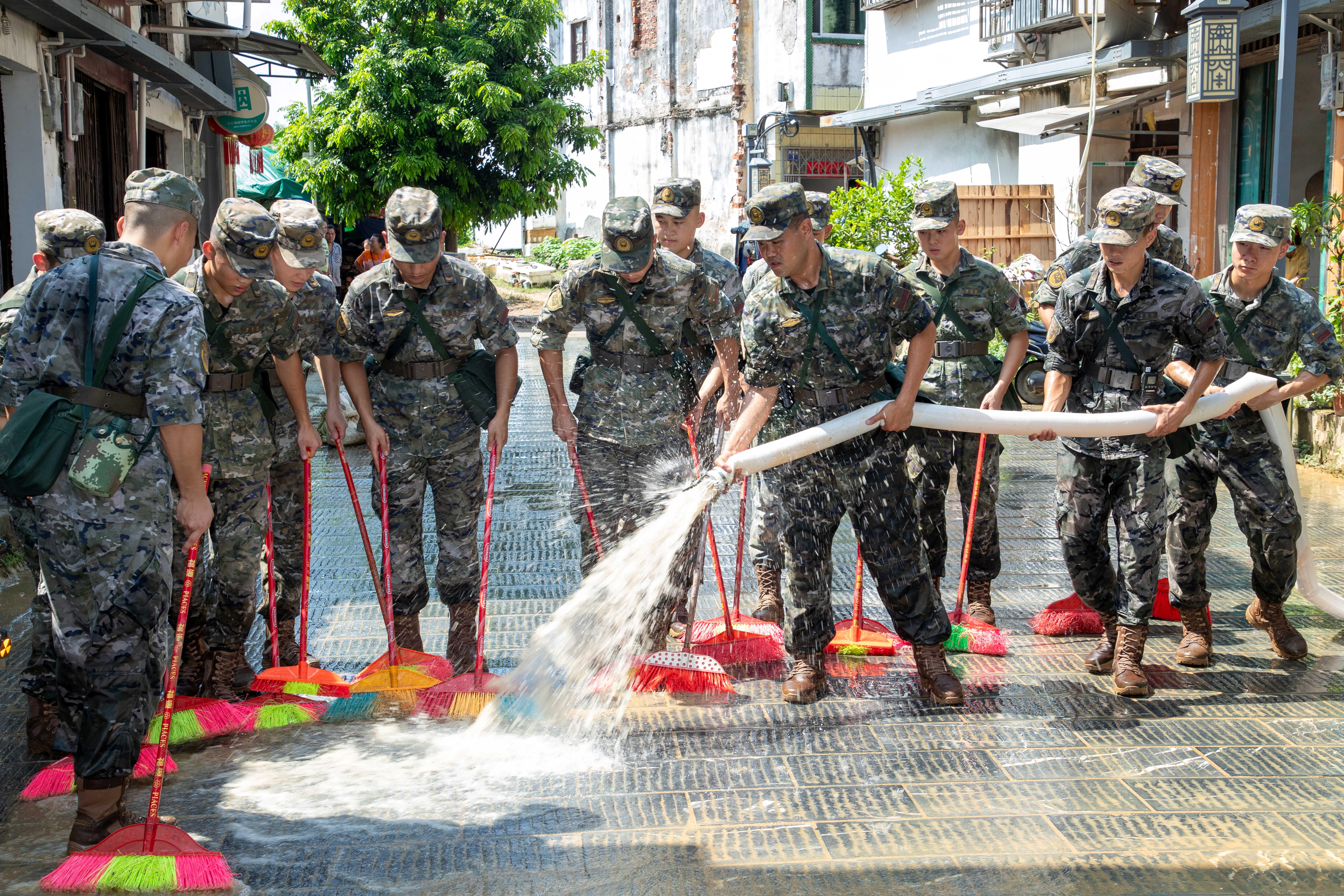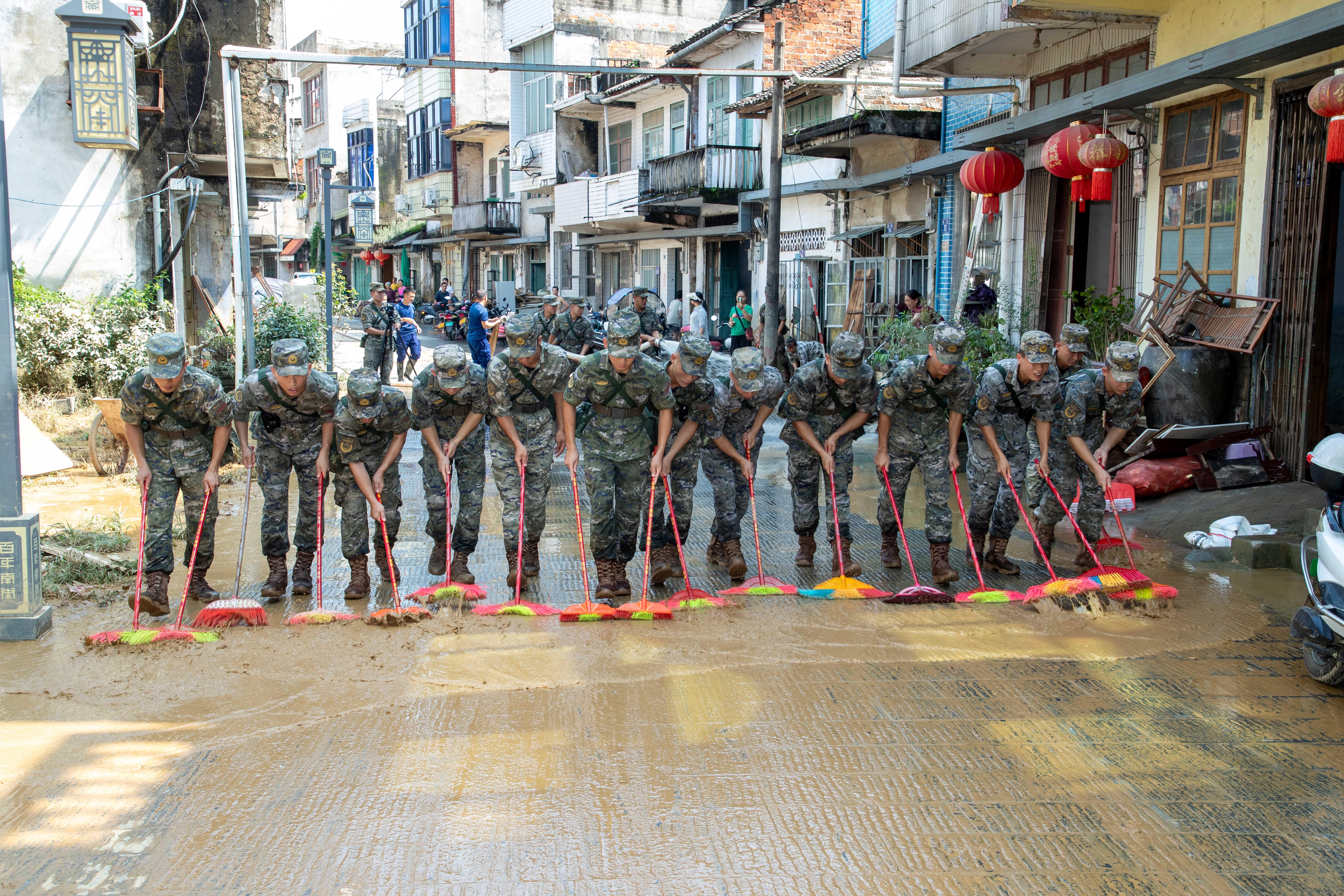 13时许,官兵抵达任务区域后,根据现场情况迅即划分为两个救援小组。一组负责协助群众转运受灾物资,另一组集中清理街道淤泥与垃圾,全面协助恢复生活秩序。