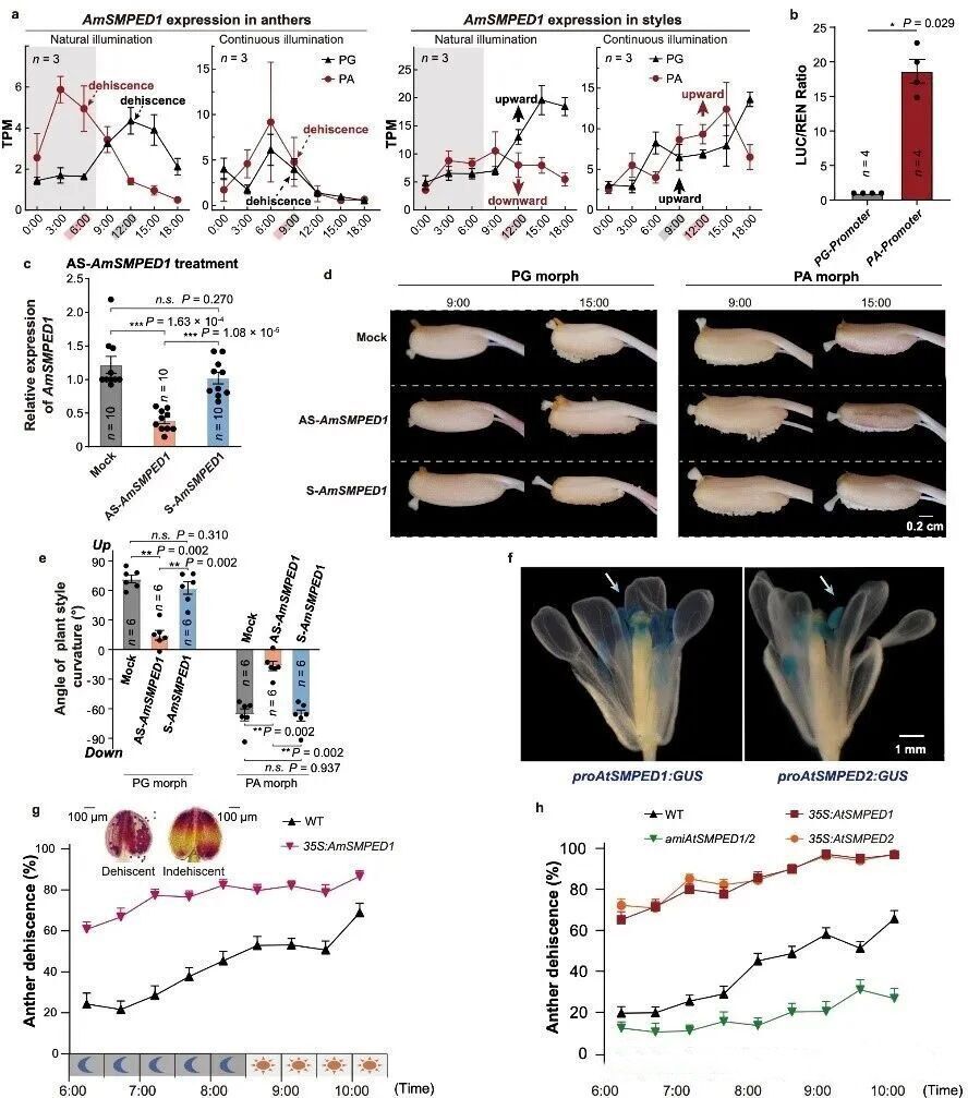在功能验证方面,通过瞬时抑制实验,研究团队发现下调该基因表达后,花柱的节律性运动完全停止;从模式植物验证方面,研究人员将该基因导入拟南芥,它可使花药提前数小时开裂,从而证明其直接调控雄蕊的成熟时间。