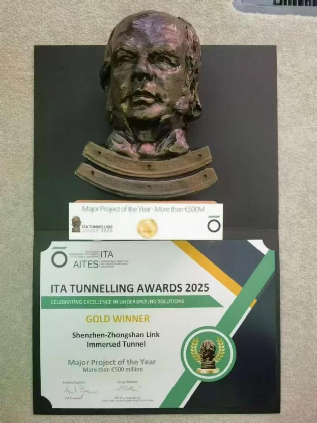 近日,第11届国际隧道与地下空间协会(ITA)隧道大奖颁奖礼暨东南欧隧道大会(SETC-2025)在塞尔维亚首都贝尔格莱德举行。由中交公路规划设计院有限公司(以下简称“公规院”)主持设计的深中通道海底隧道斩获本届大会最具分量的ITA重大工程奖金奖。这也是自2018年凭借港珠澳大桥海底隧道获ITA重大工程奖之后,“公规隧”再度获得的全球隧道行业最高荣誉。这两项重大隧道工程也于去年入选了“ITA成立50周年全球隧道与地下工程领域50项标志性工程”。