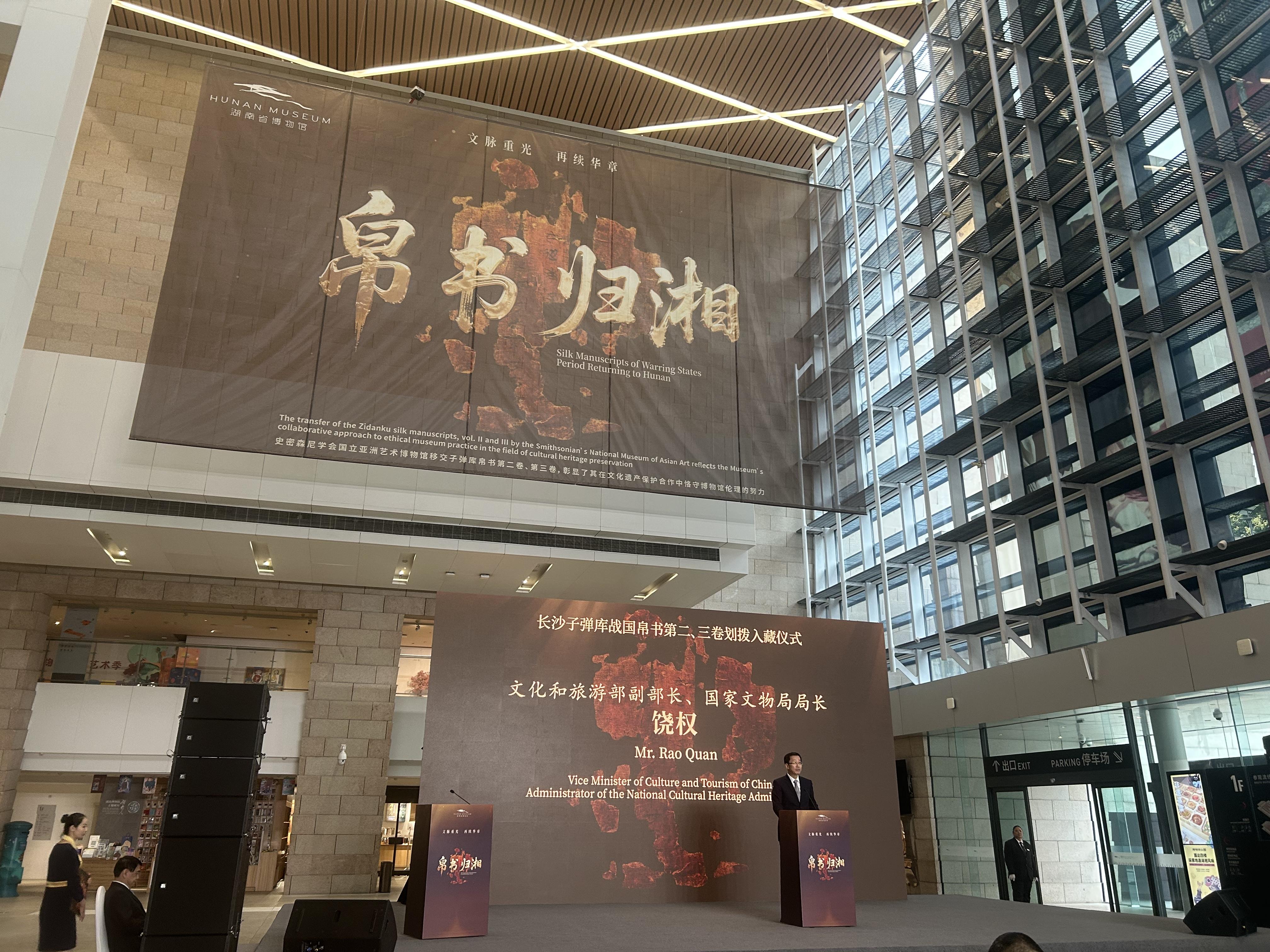 文化和旅游部副部长、国家文物局局长饶权表示,期待此次帛书入藏湖南省博物馆后,能有助一体推进“科技+保护+研究+展示+教育”,让该帛书成为中国古代纺织品保护的标杆,数字技术赋能文物活化利用的典范,以及文博国际合作的样板。