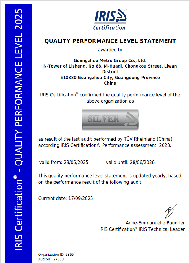 广州地铁将以此次认证为契机,进一步推动管理创新与服务升级,持续提升运营质量与乘客体验,助力行业高质量发展。