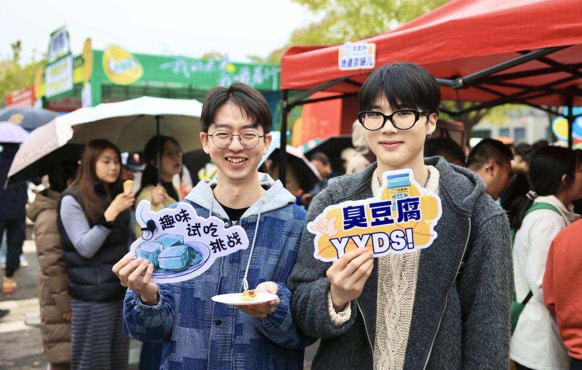 活动现场,王致和设置了多个互动区域。文创打卡区陈列着独具特色的文创产品。美食体验区的王致和臭豆腐干、拌饭酱配吐司片等特色美食引来学生们排队品尝。