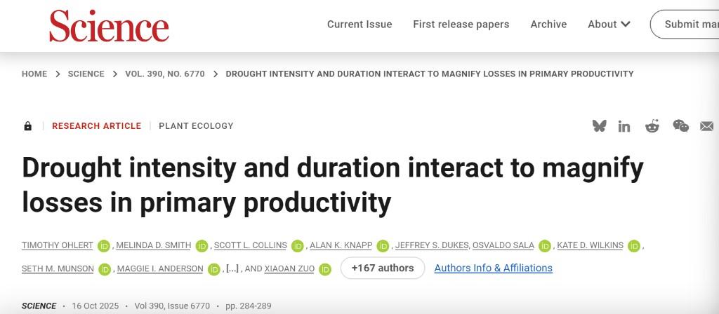 10月17日,记者从北京林业大学获悉,该校庾强教授团队联合全球28个国家126家单位的177位科研人员,在最新一期的国际顶级期刊《科学》发表题为“干旱强度和持续时间互作加剧初级生产力的损失”的研究论文,以突破性科研发现,首次系统揭秘极端干旱生态影响机制,为全球干旱生态研究提供关键科技支撑。这是该校建校73年来首篇《科学》正刊论文。