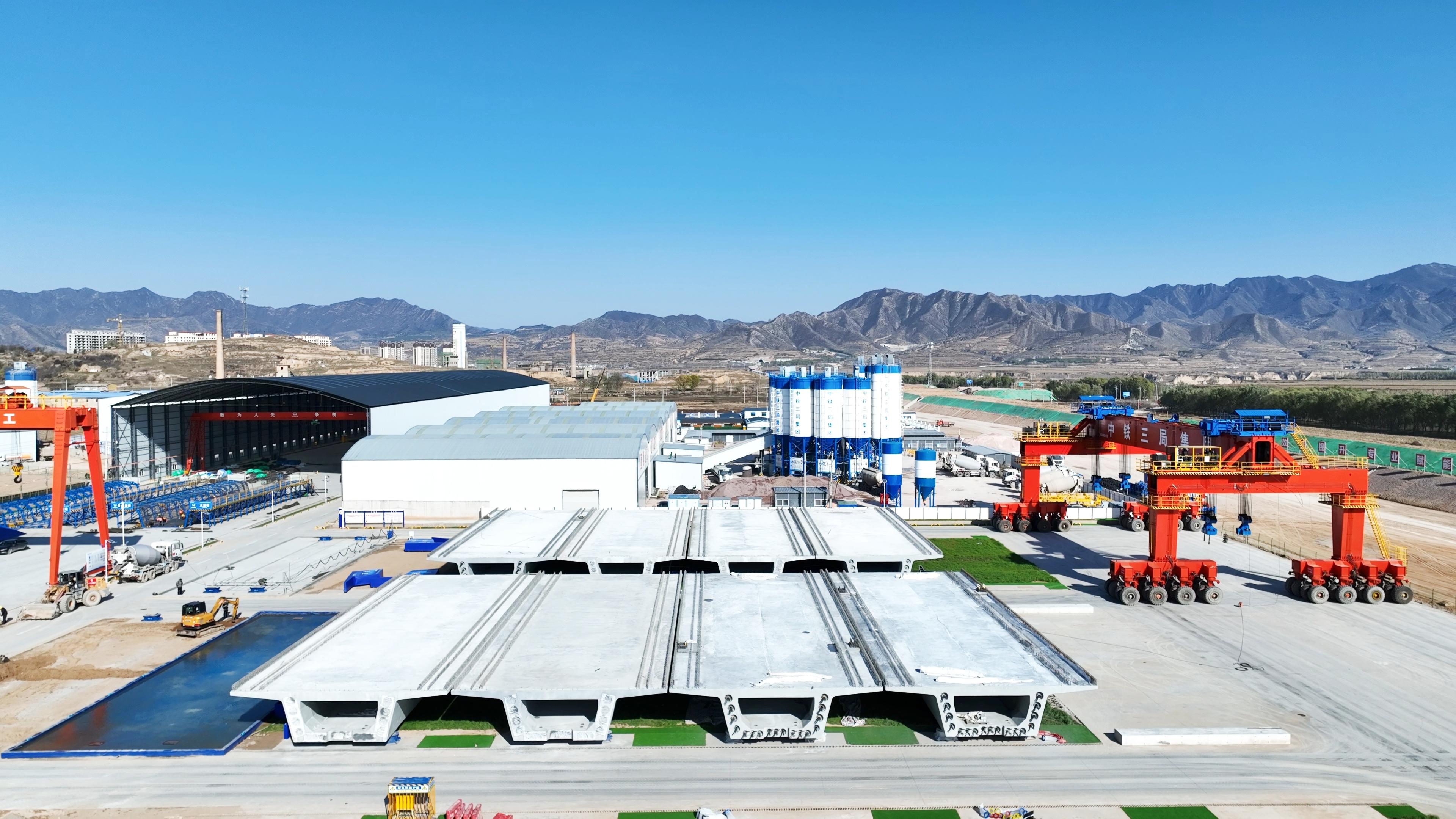 五台制梁场还创新应用混凝土智能布料振捣、端模液压自动脱模、智能梁体张拉养护等新技术,并借助人工智能、物联网技术加强梁场全生命周期管理,引进新能源绿色装备助力施工生产,实现箱梁预制安全、质量、工效、环保的同步增效,快速优质完成全部制梁任务。