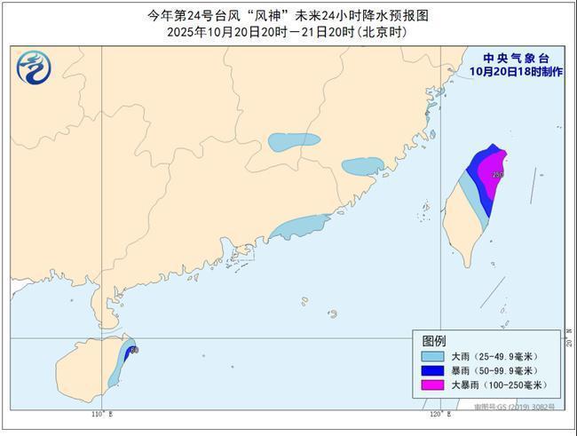 降水预报:20日20时至21日20时,福建东北部和南部、江西南部、广东东南部沿海、海南岛东部、台湾岛中北部有大到暴雨,台湾岛北部局地有大暴雨(100-250毫米)。