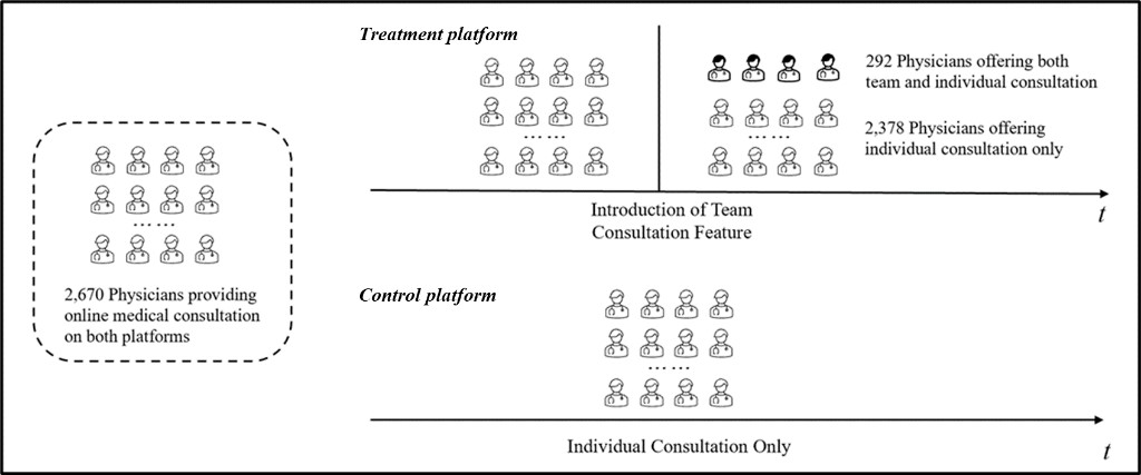 为了深入探究这一问题,研究团队从两个在线问诊平台收集了数据。这两个平台都提供个人问诊服务,但其中一个还额外提供了团队问诊服务。通过运用前沿的因果推断方法——三重差分,研究发现:虚拟团队协作不仅显著提升了医生在个人问诊中的服务质量,还通过服务协同的同侪效应,推动了医疗资源的优化配置。虚拟团队协作通过社会比较的同侪效应,激发医生在个人问诊中投入更多努力,表现为回复内容更长、情感支持术语更多、医疗术语更新更频繁,实现了从团队任务到个体服务的无缝协同。