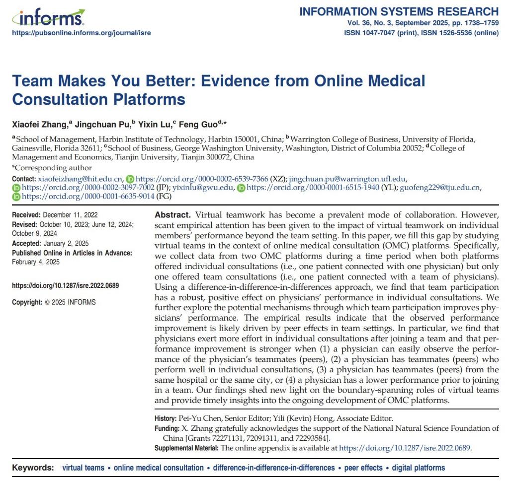 日前,哈尔滨工业大学经济与管理学院的张晓飞教授、天津大学管理与经济学部的郭峰副教授与海外合作者在虚拟团队管理领域取得突破性进展。研究成果发表于国际管理学顶级期刊《信息系统研究》。