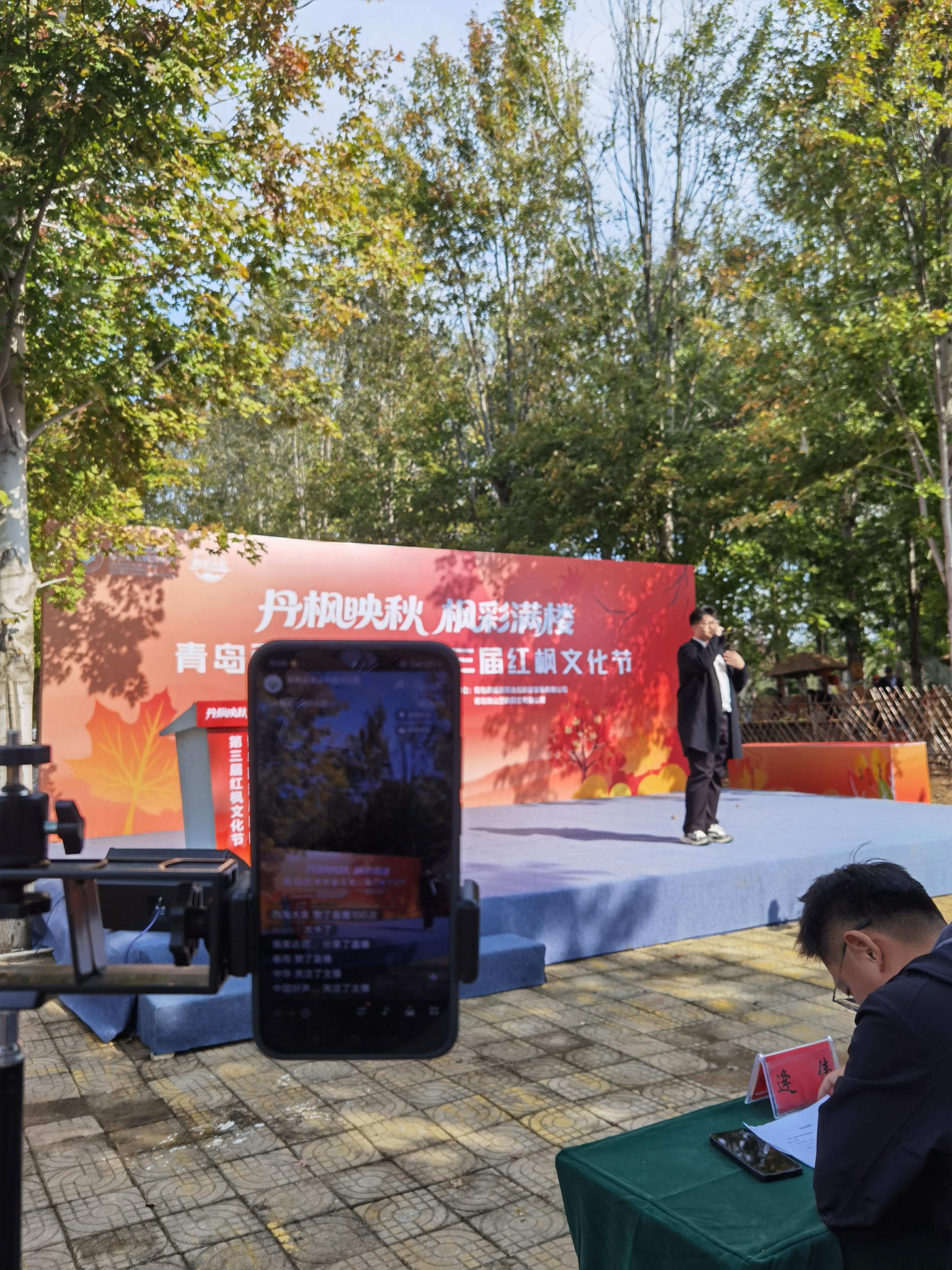 “家人们,快看这片红枫林,美得像一幅油画!咱张家楼的红枫林,拍照打卡根本不用加滤镜!”10月19日,在青岛西海岸新区第三届红枫文化节开幕现场,张家楼街道平柳山庄负责人张茂华操着乡音,向直播间里的网友展示着红枫美景。