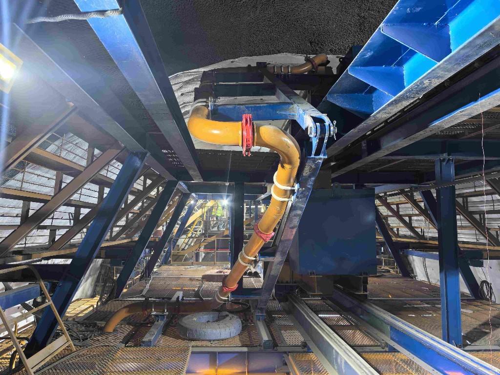 该工艺的核心在于纵向灌注台车与可视化信息监控系统的协同应用。纵向灌注台车整体尺寸达16.8米×13.4米×9.945米,配备直径125毫米、长度16.3米的可伸缩纵向管道,可深入二衬台车内部11.4米;施工时按“自下而上循环”布设管路,顶部纵向枪管直达二衬台车内部关键区域。混凝土浇筑分两步推进:先通过二衬台车完成四级工作窗及以下部分浇筑,再启动纵向灌注台车,对四级窗口至拱顶区段进行浇筑。