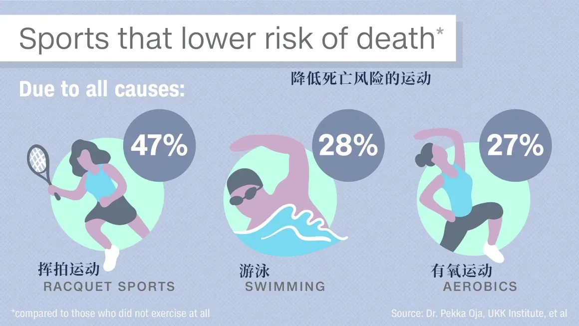 适量运动有助延寿。2016年《英国体育医学杂志》一项涉及8万人,关于不同种类运动和全因死亡率的关系研究发现:最佳的延寿运动是——挥拍类运动(羽毛球、乒乓球、网球等),可以降低全因死亡率47%。