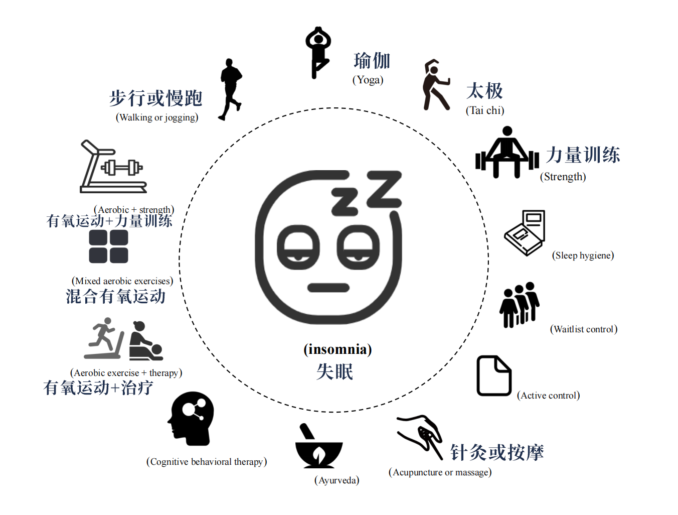 瑜伽、太极、步行和慢跑在提升睡眠效率、延长睡眠时间、缩短入睡时间等方面表现突出。其中,瑜伽对总睡眠时间的增加效果最为显著(平均延长110分钟),太极可改善睡眠结构,步行与慢跑则能有效缓解失眠引发的日间功能障碍。