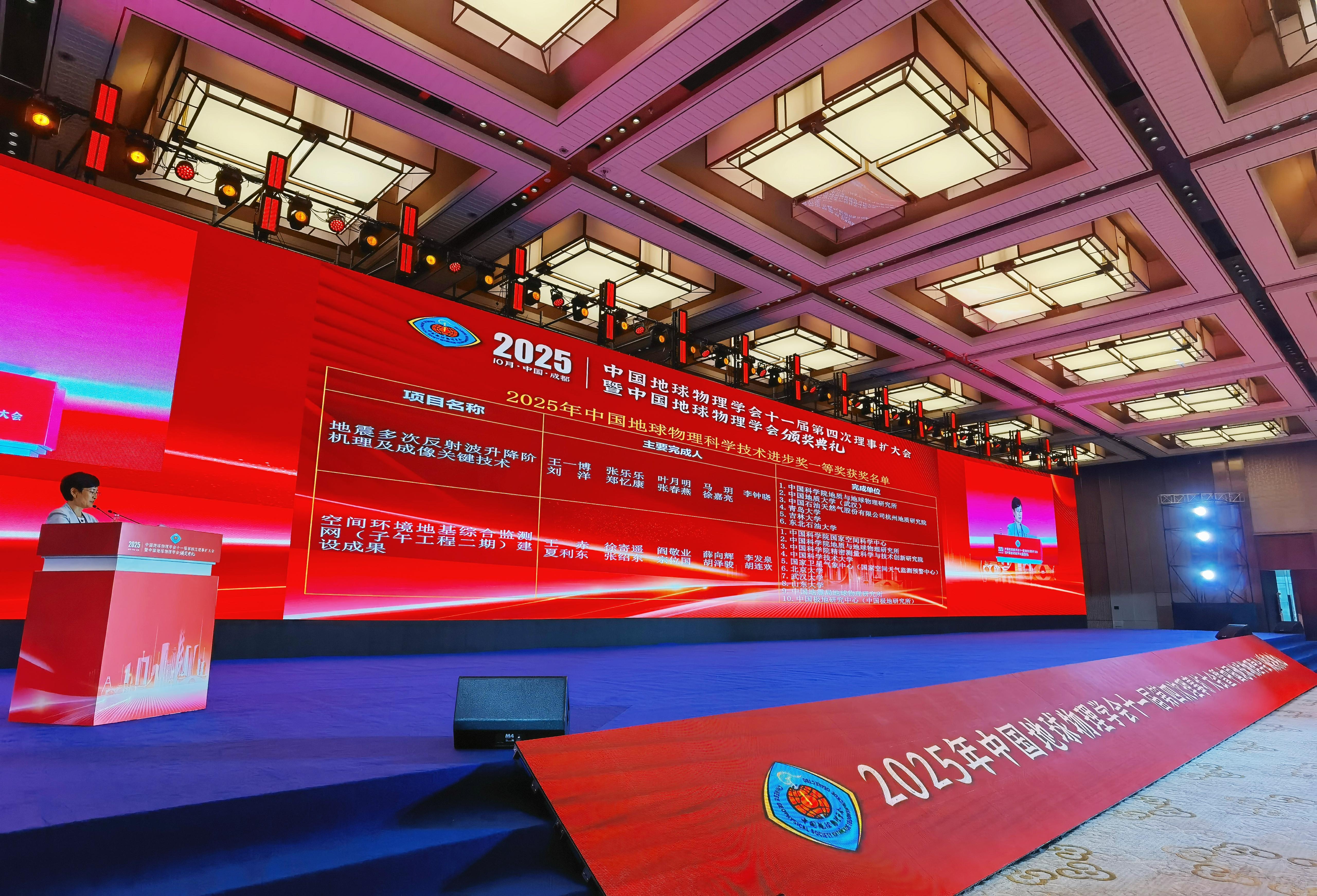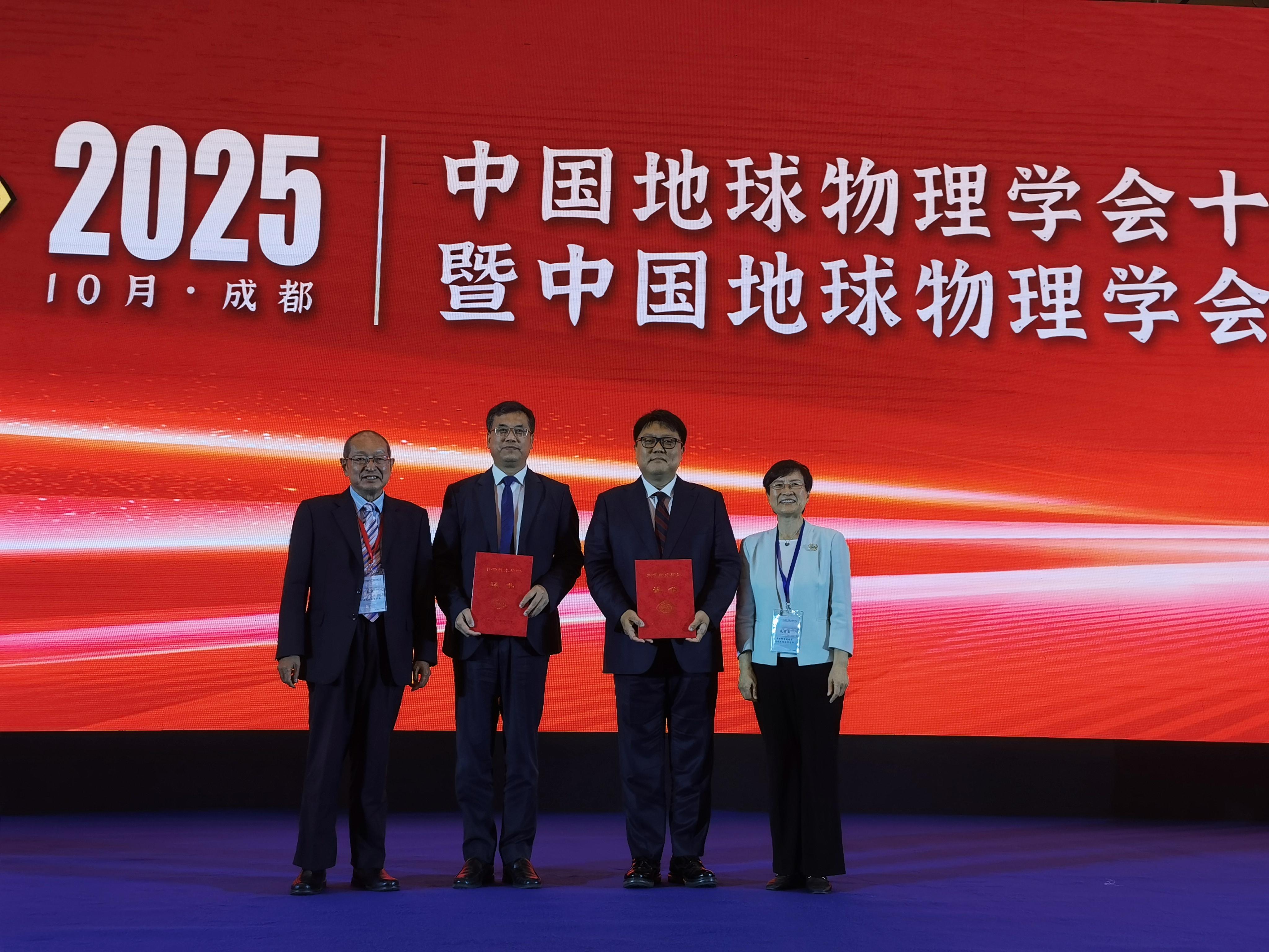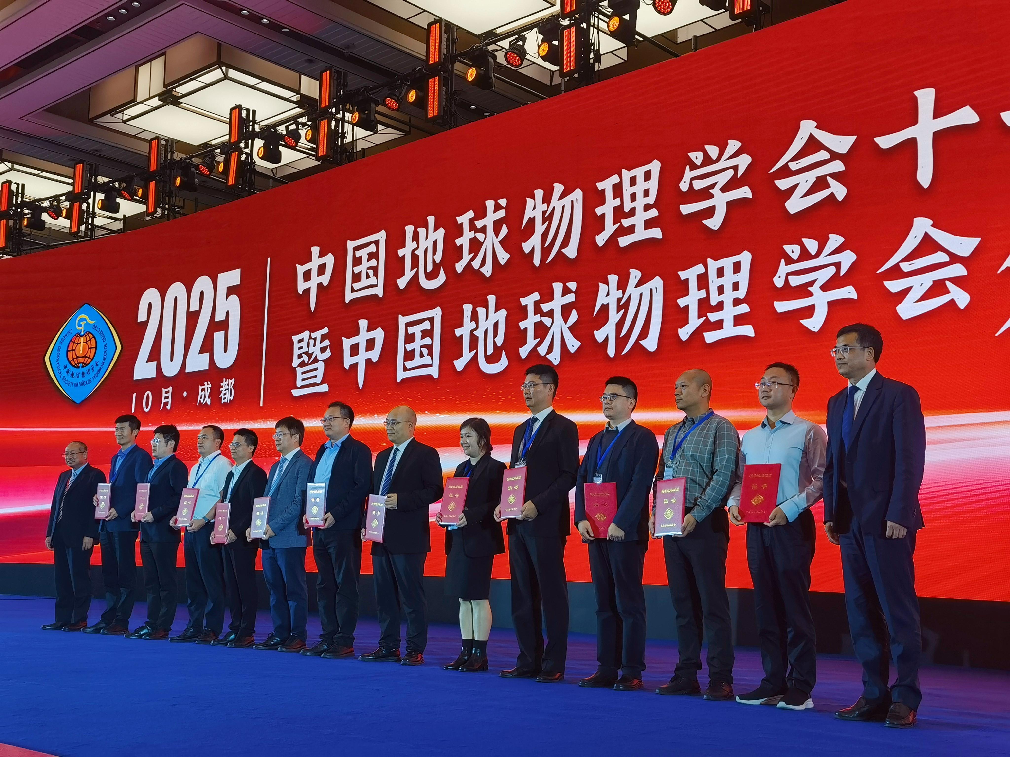 颁奖典礼上,两项成果获中国地球物理学会科学技术进步奖一等奖。“地震多次反射波升降阶机理及成像关键技术”与“空间环境地基综合监测网(子午工程二期)建设成果”脱颖而出,中国科学院院士、中国地球物理学会理事长底青云为两项获奖成果团队代表王一博、王赤颁奖。