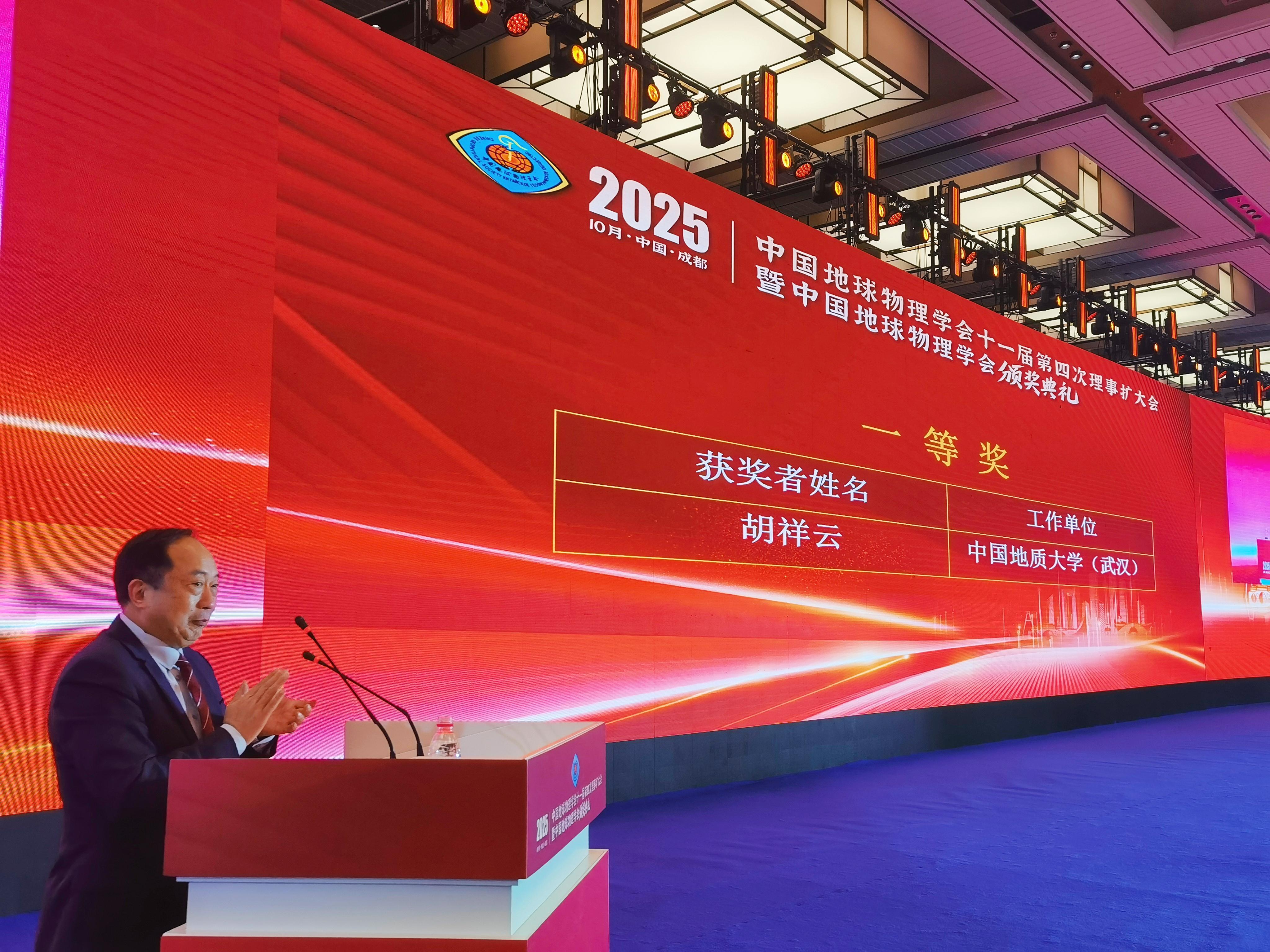 中国科学院院士陈晓非宣读中国地球物理学会科技创新一等奖,中国地质大学(武汉)教授胡祥云获奖,陈晓非为其颁奖。