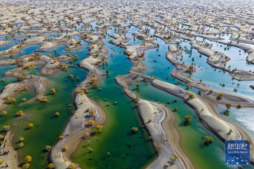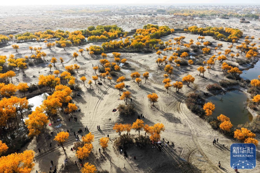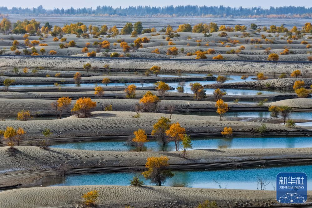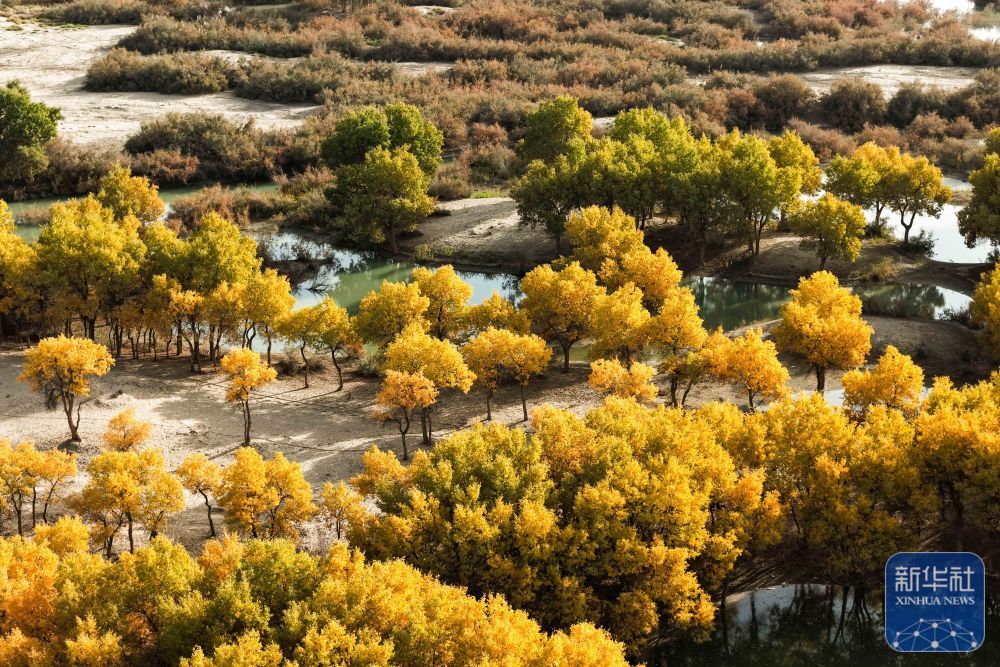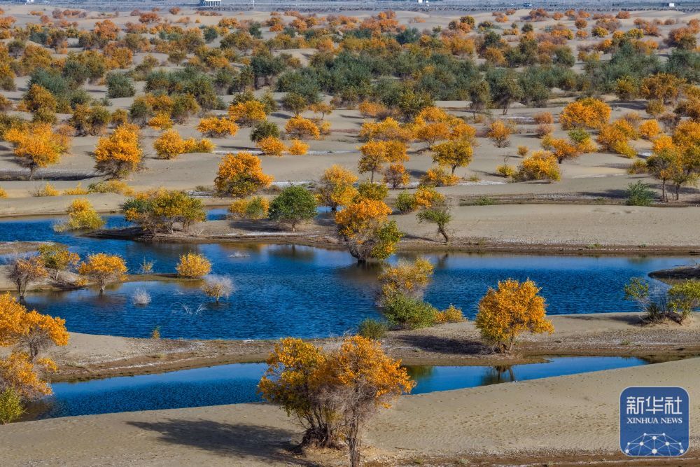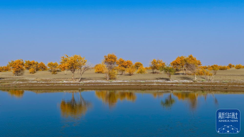 时下,新疆和田地区的胡杨迎来最佳观赏期,成片换妆的胡杨林与水天相映,共绘金秋美景。 新华社记者 辛悦卫 摄