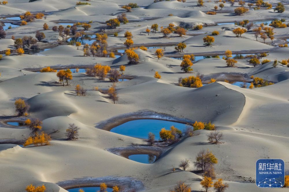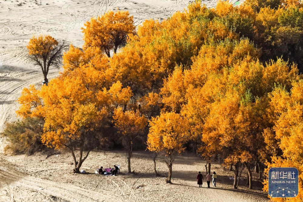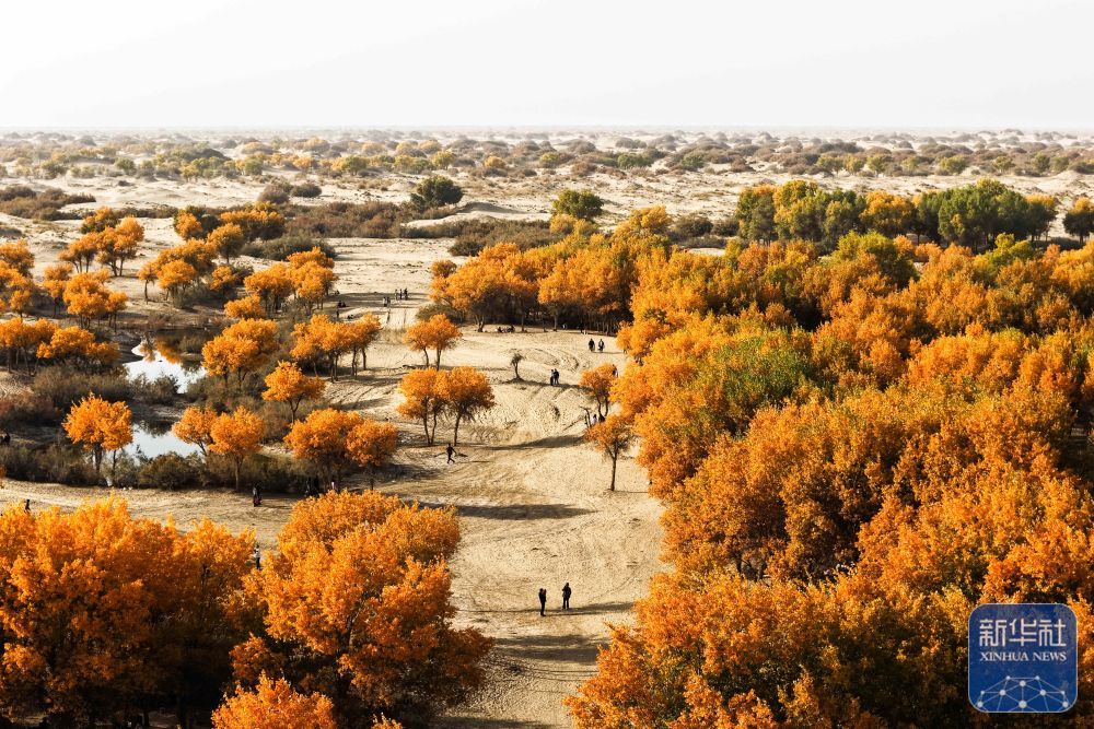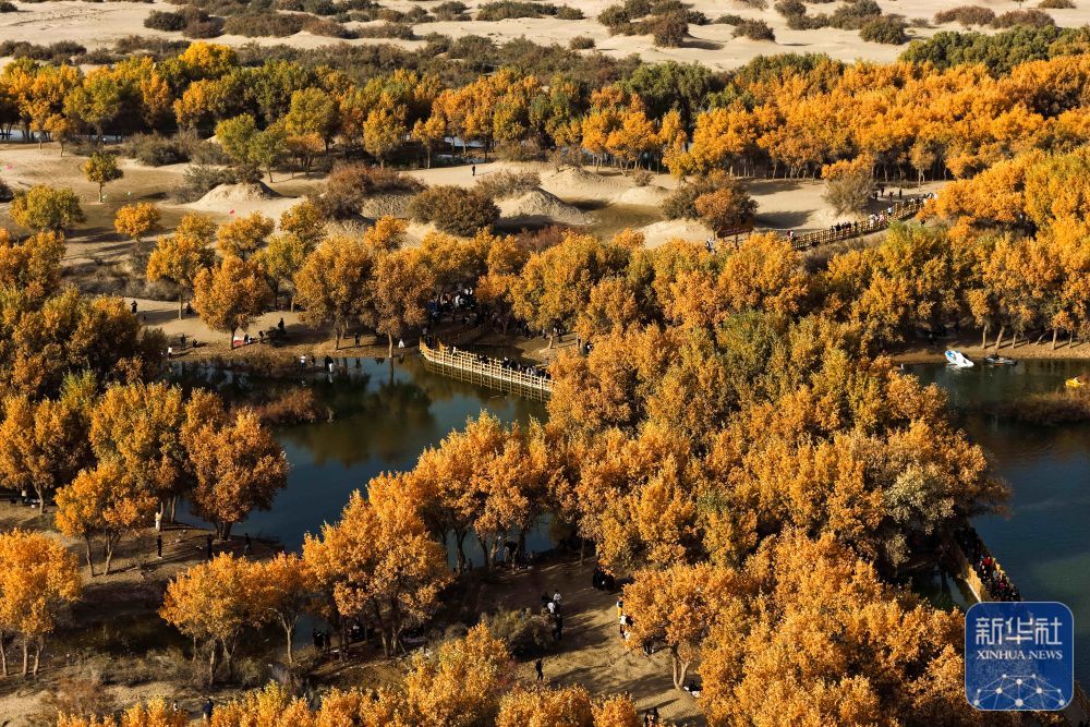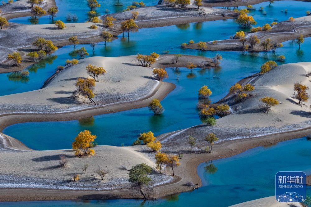 时下,新疆和田地区的胡杨迎来最佳观赏期,成片换妆的胡杨林与水天相映,共绘金秋美景。 新华社记者 辛悦卫 摄