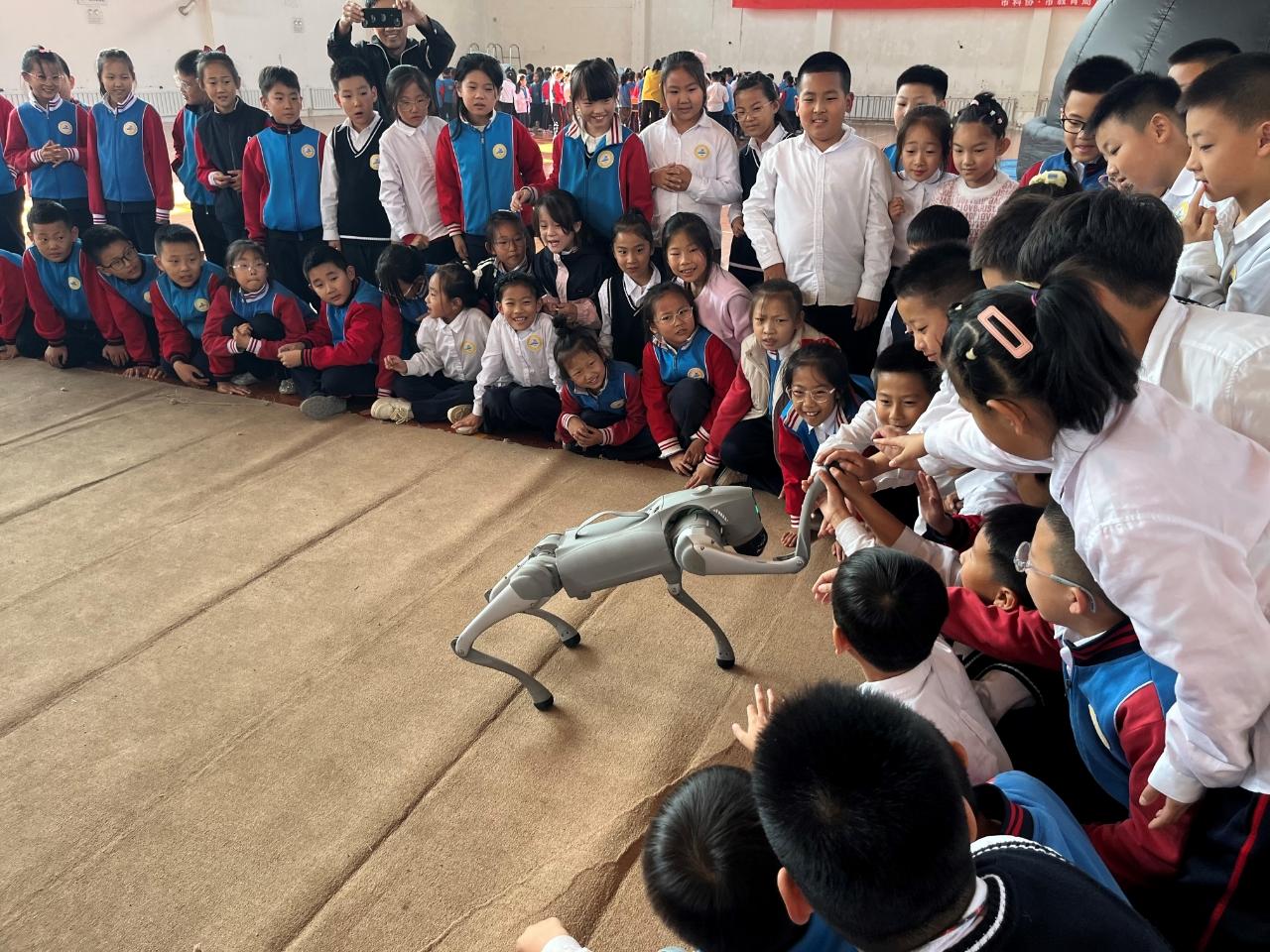 活动现场以“互动体验”为核心,设置三大特色功能区,让抽象的科学知识变得可触可感。在机器狗互动区,专业工作人员精准操控,机器狗灵活完成跳跃、打滚、翻转、跳舞等动作,憨态可掬又充满科技感的表演,引得同学们阵阵欢呼,现场气氛瞬间被点燃。